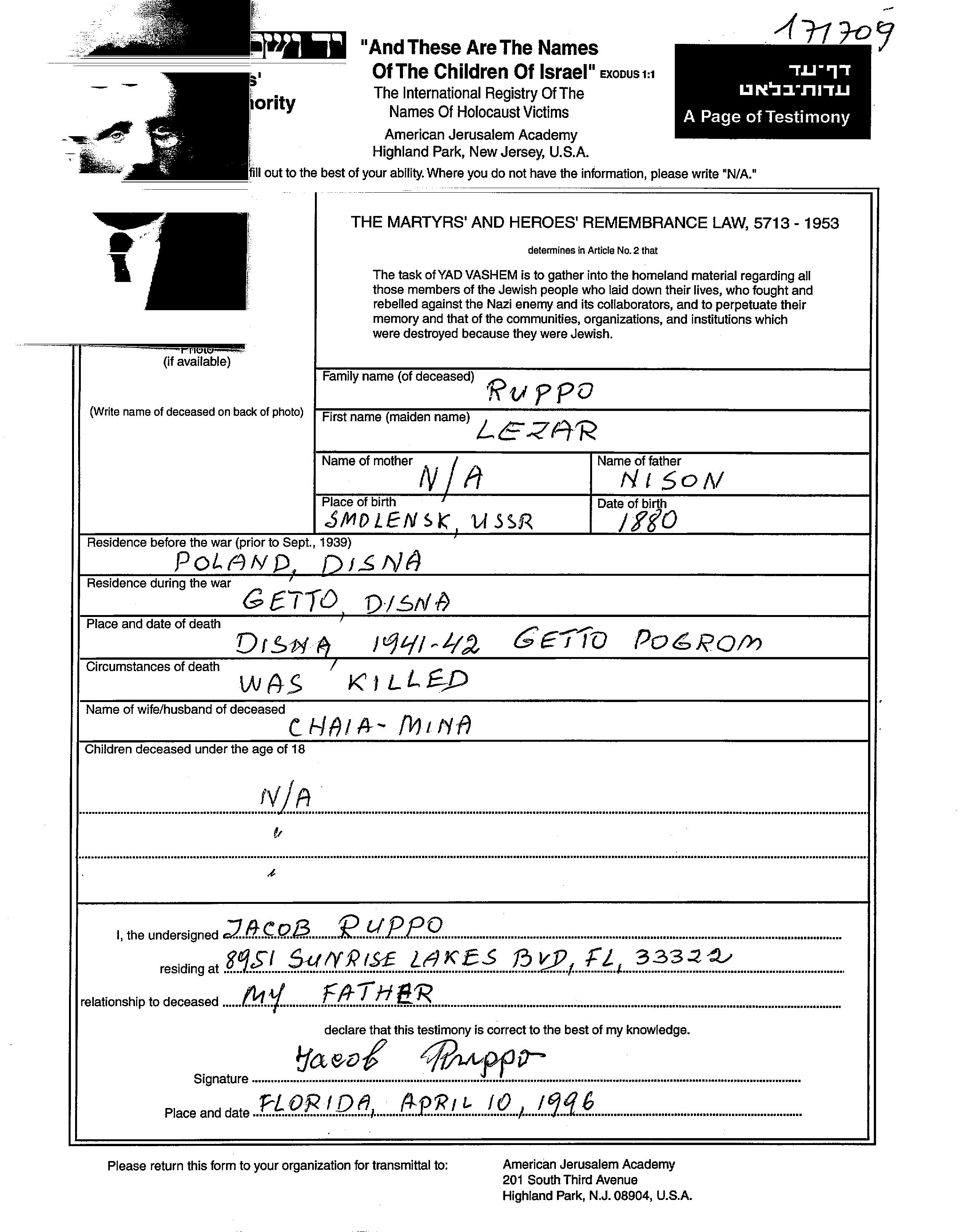 Lezar Ruppo נולד בSmolensk שברוסיה (ברה"מ) בשנת 1880. לפני מלחמת העולם השניה התגורר בDzisna שבפולין.