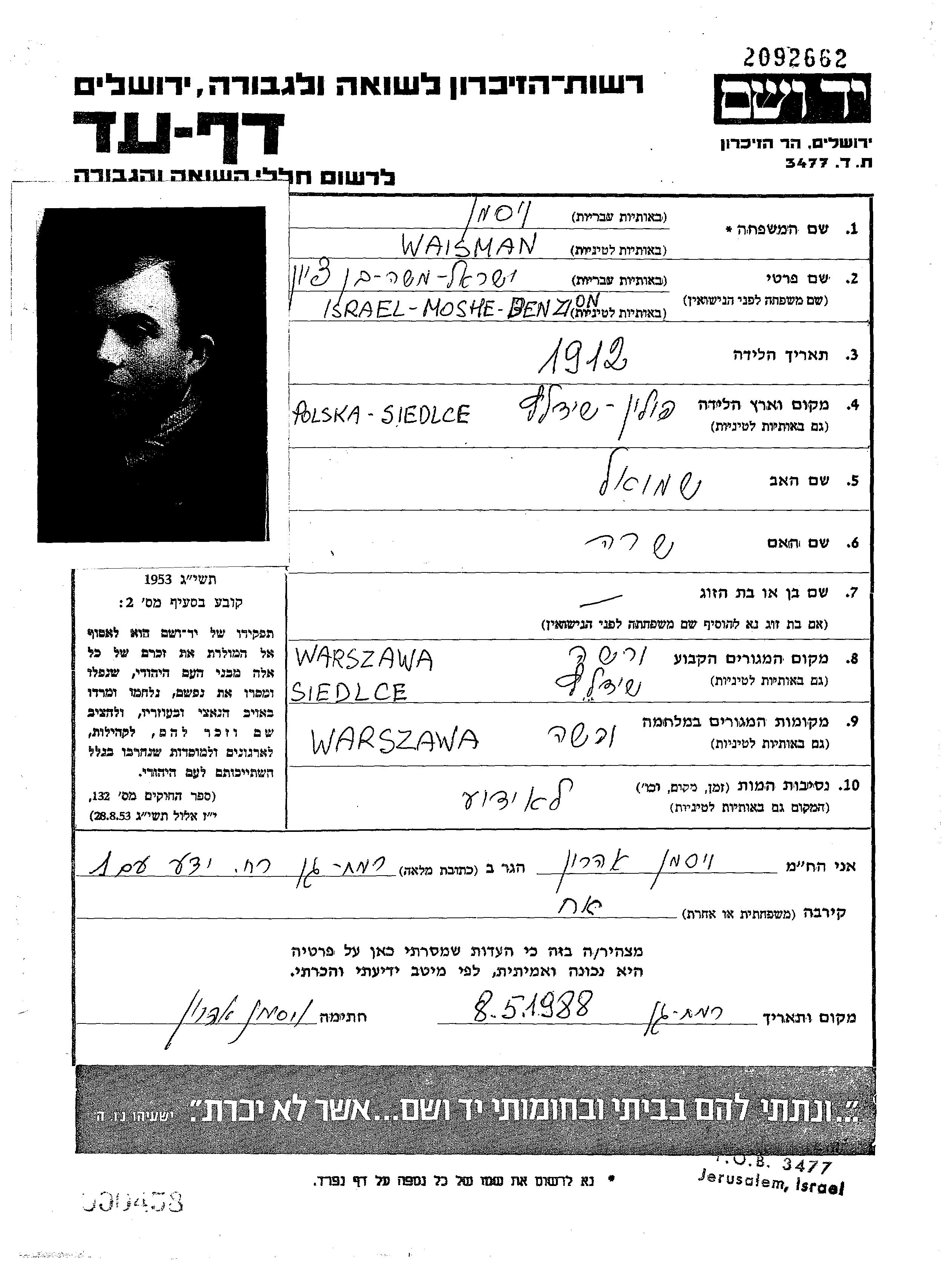 Israel Benzion משה Waisman נולד בSiedlce שבפולין. לפני מלחמת העולם השניה התגורר בSiedlce שבפולין.