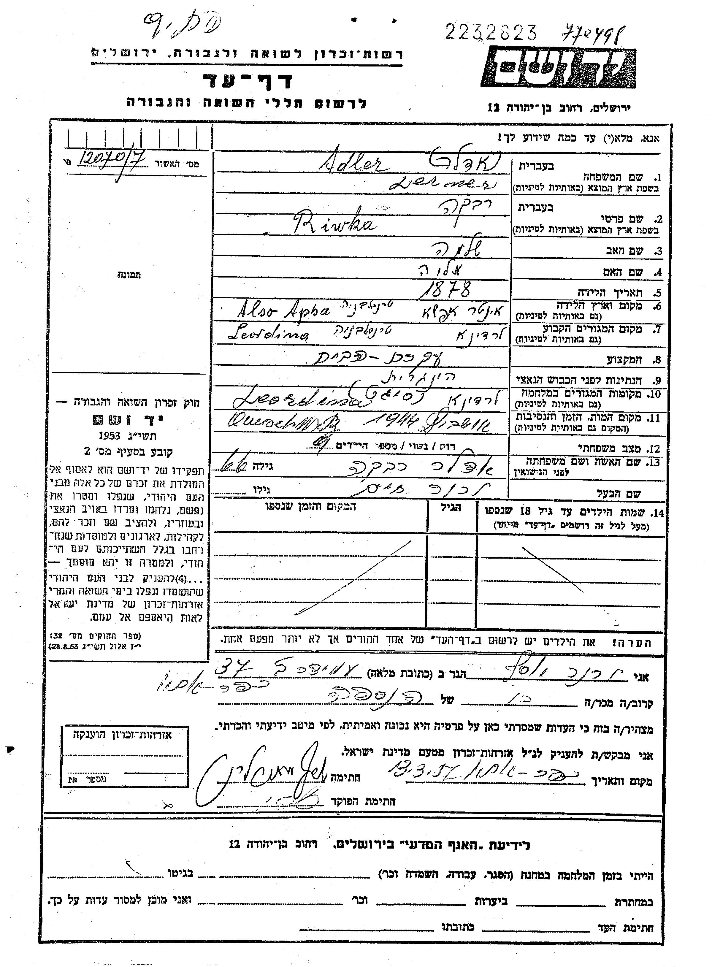 Riwka אדלר לרנר לבית אדלר נולדה בInterapsze שבצ'כוסלובקיה בשנת 1878. היא היתה עקרת בית. לפני מלחמת העולם השניה התגוררה בLeordina שברומניה.