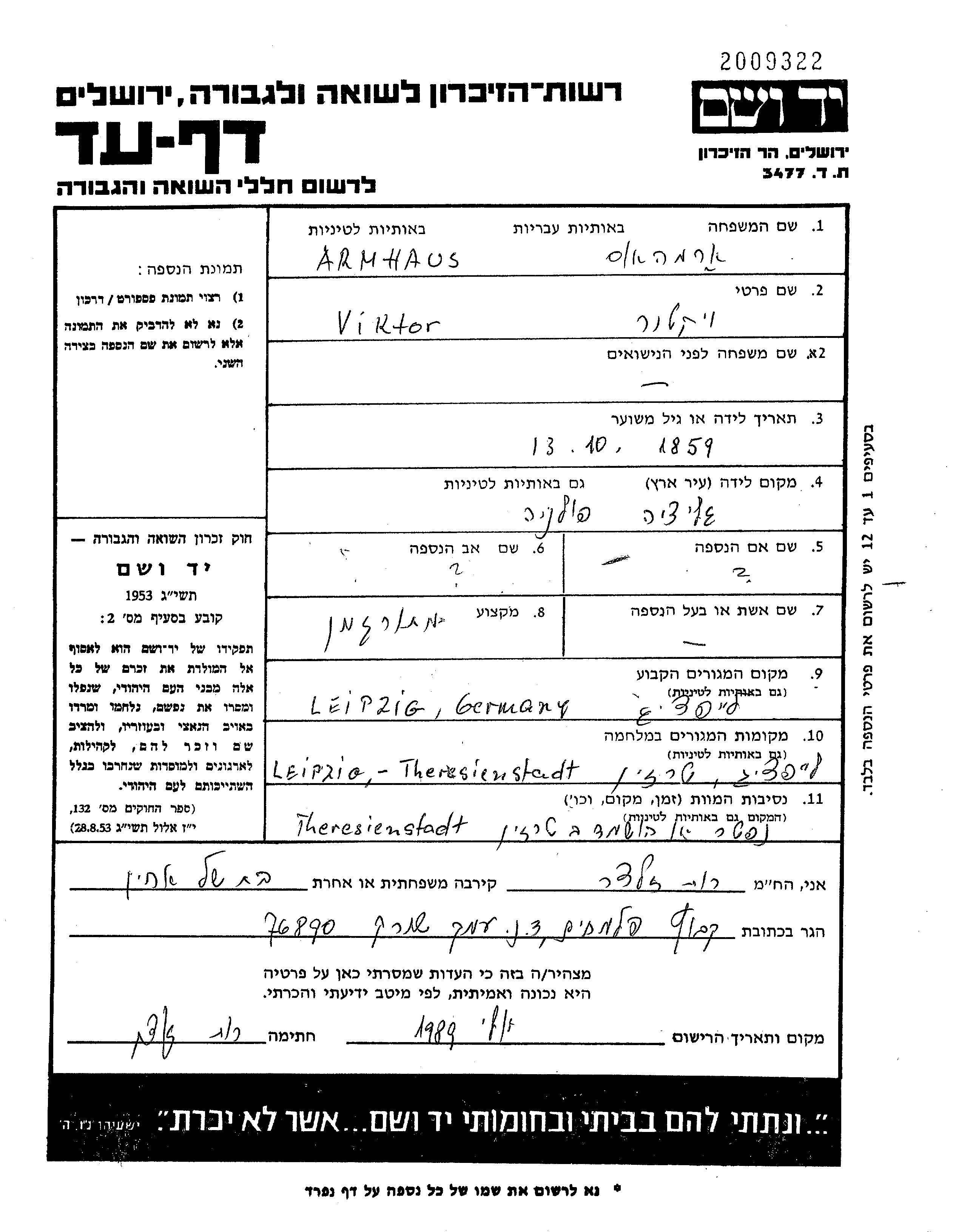 ויקטור נרצח בשואה. מקום המוות: Terezin שבצ'כוסלובקיה בשנת 1944.