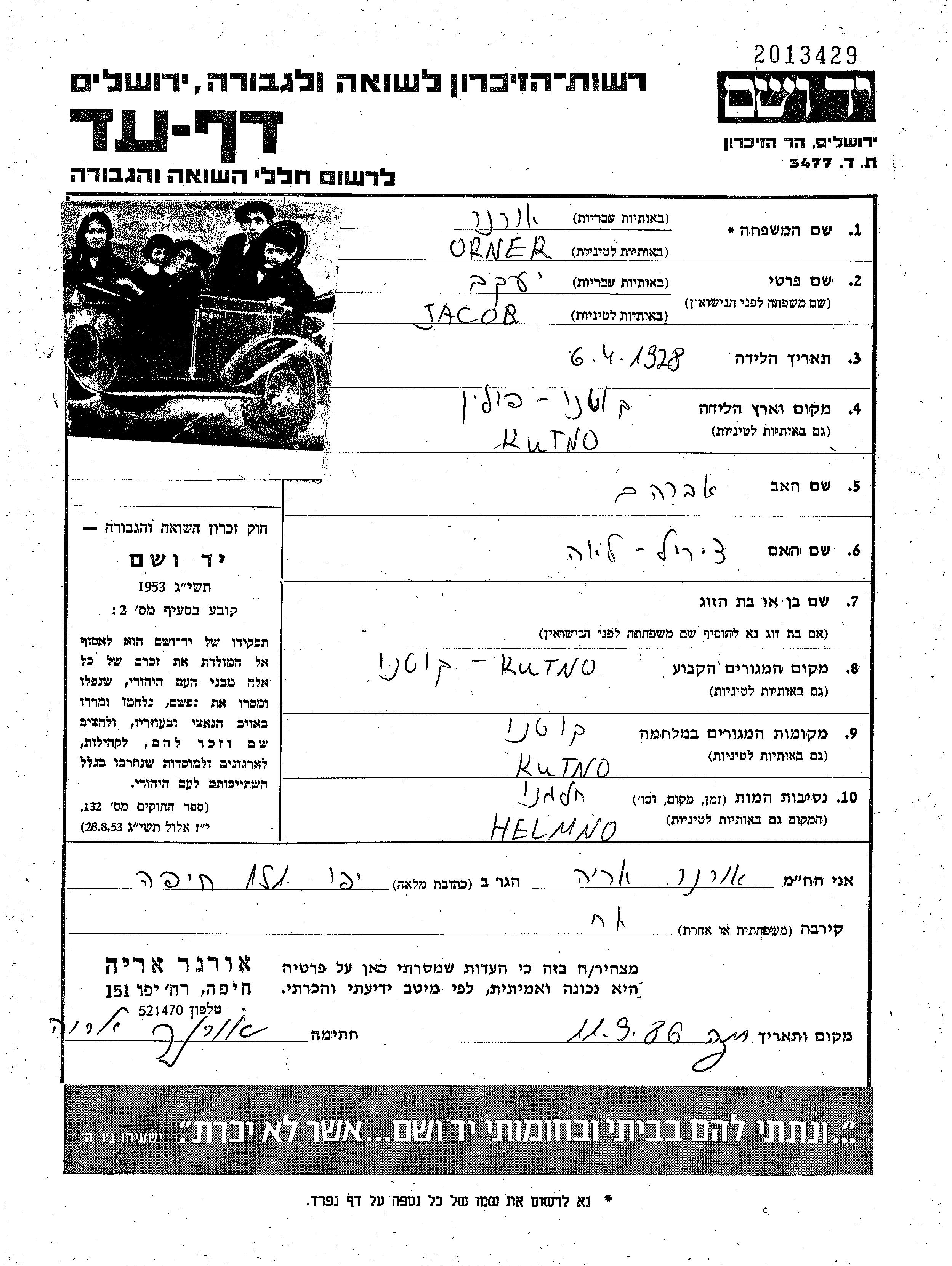 Jacob אורנר נולד בKutno שבפולין בשנת 1928. לפני מלחמת העולם השניה התגורר בKutno שבפולין.