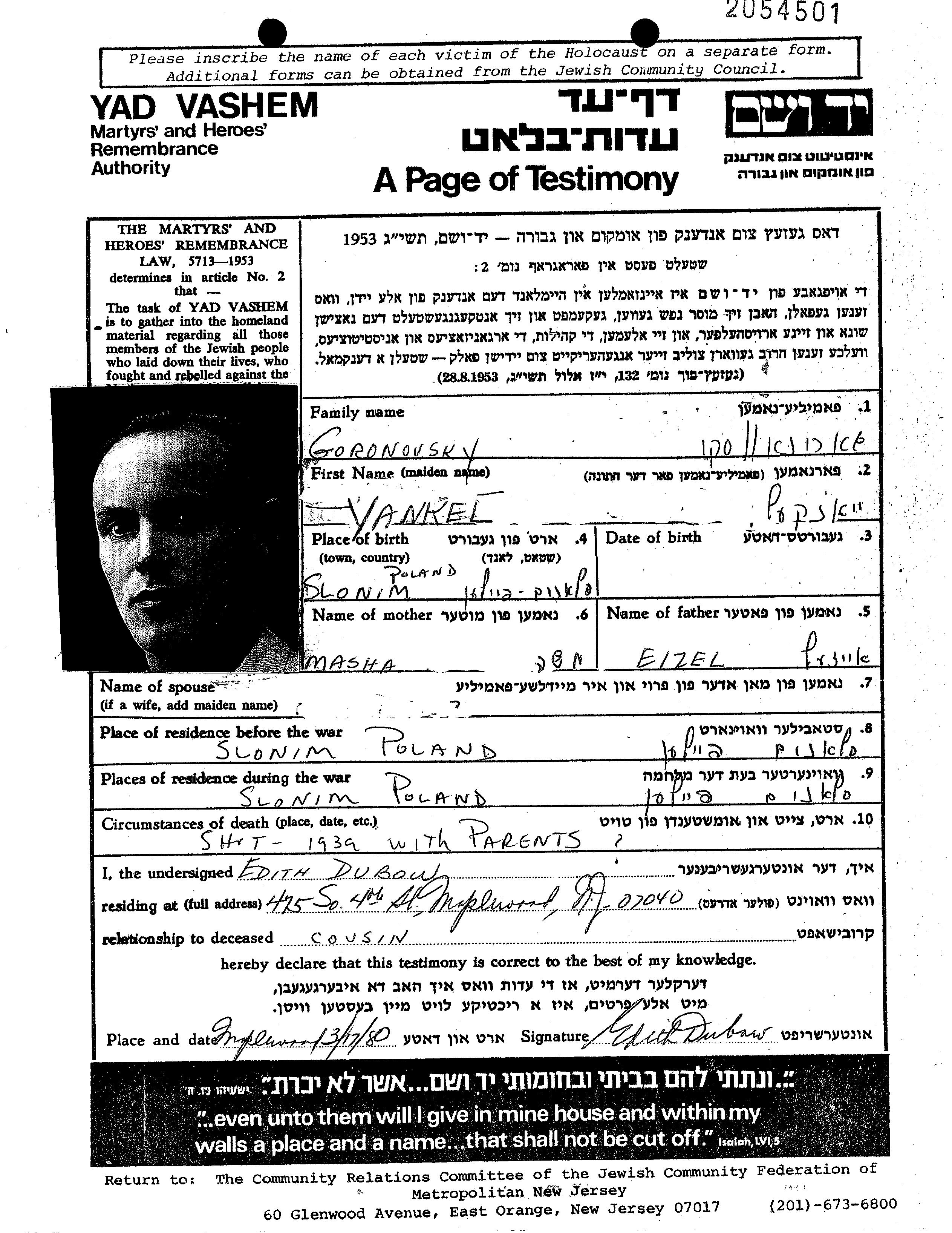 Yankel Goronovsky נולד בSlonim שבפולין. לפני מלחמת העולם השניה התגורר בSlonim שבפולין.
