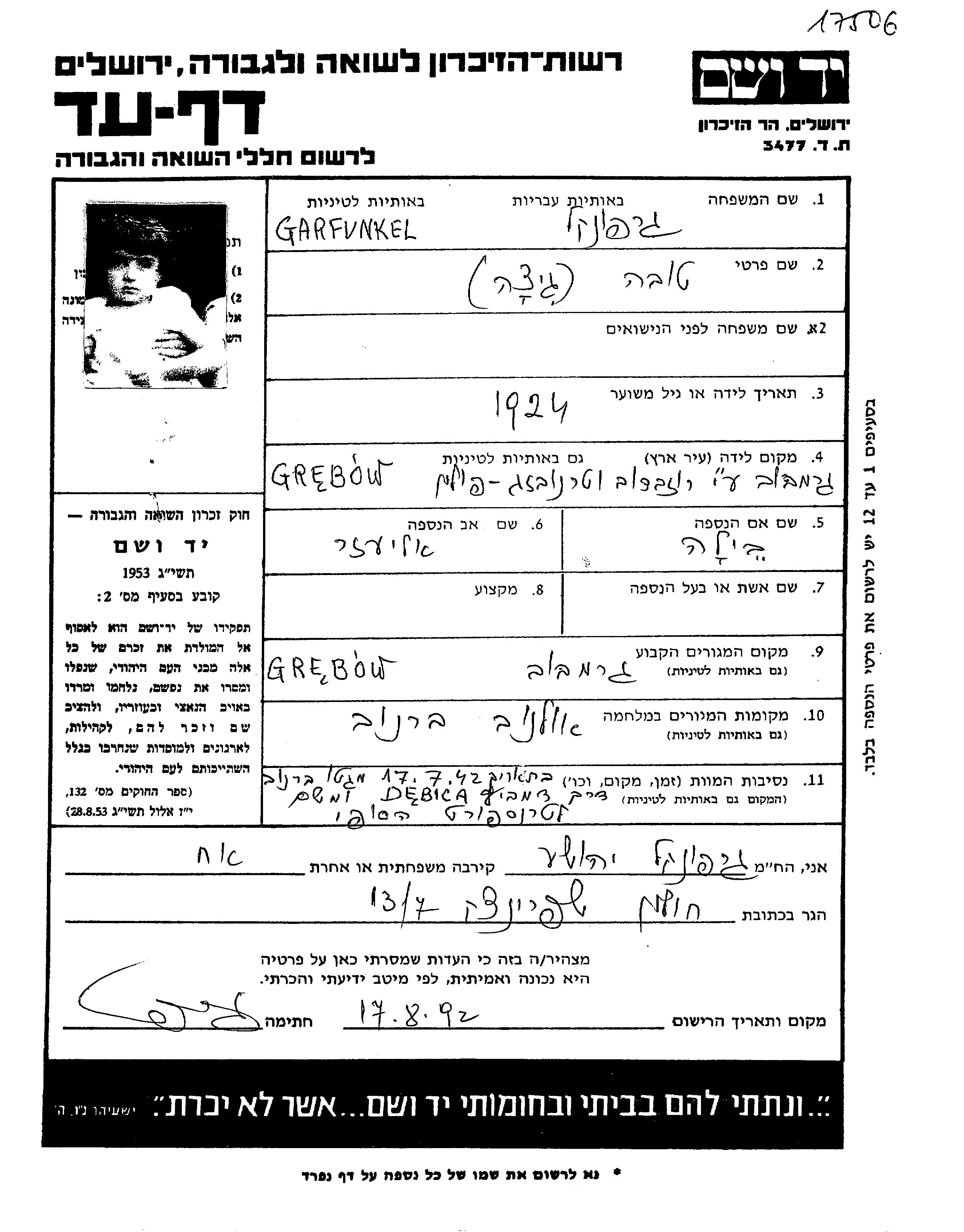 Gitza טובה גרפונקל נולדה בGrebow שבפולין בשנת 1924. לפני מלחמת העולם השניה התגוררה בGrebow שבפולין.