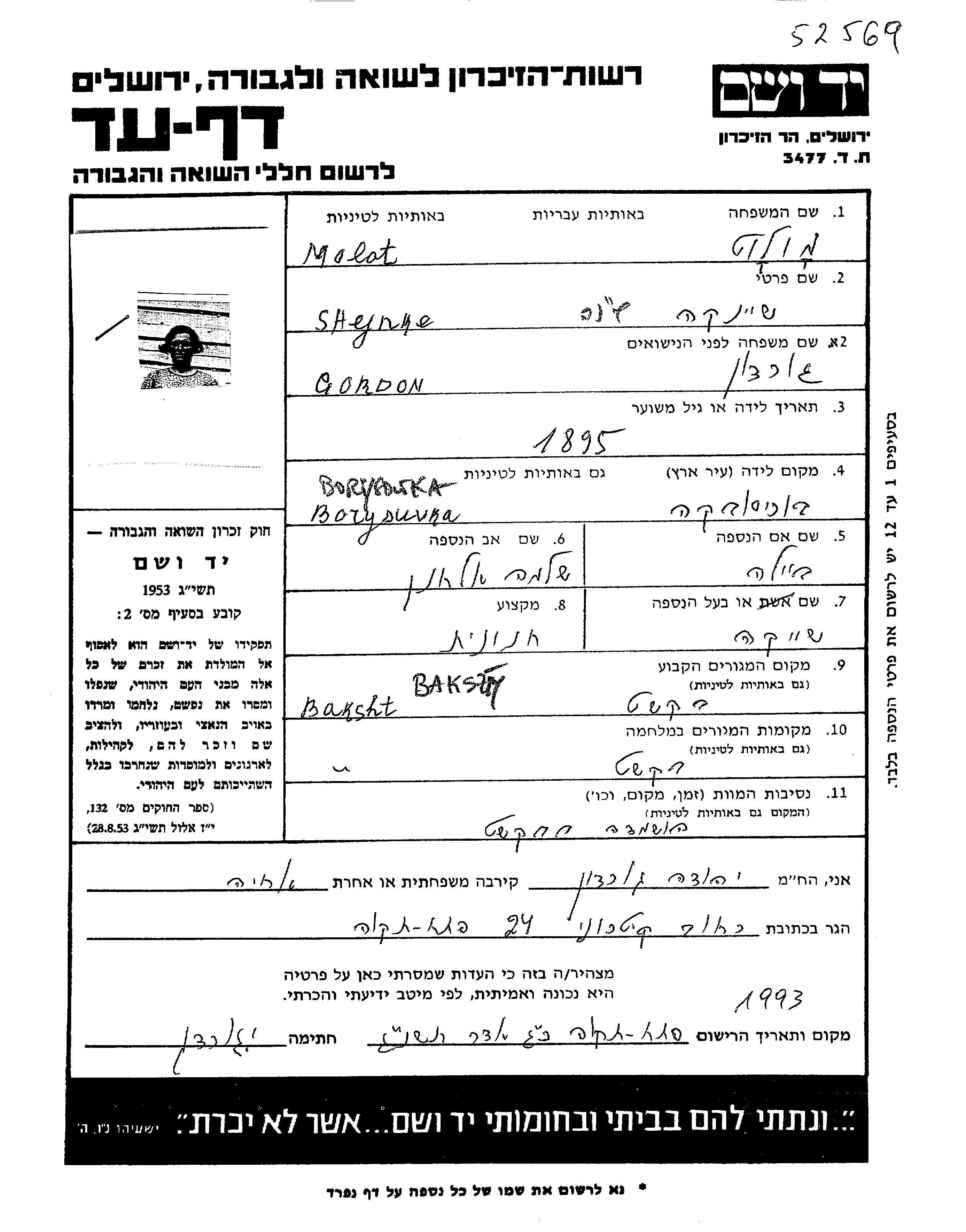 Shejnke מולוט לבית גורדון נולדה בBorysowka שבפולין בשנת 1895. היא היתה בעלת חנות. לפני מלחמת העולם השניה התגוררה בBakszty שבפולין.