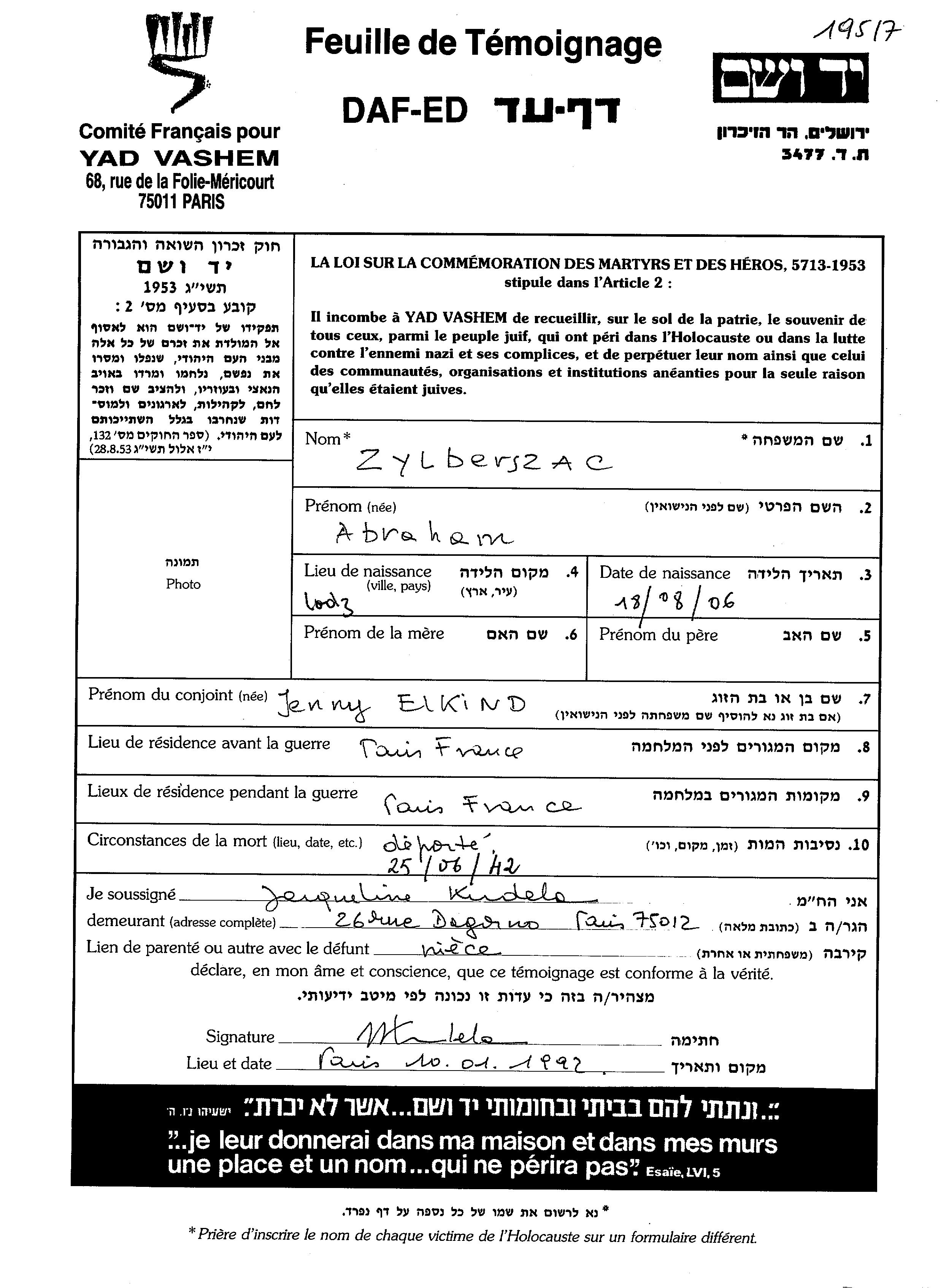 Abraham Zylberszac נולד בLodz שבפולין בשנת 1906. הוא היה נשוי לJenny. לפני מלחמת העולם השניה התגורר בParis שבצרפת. בזמן המלחמה הוא היה בParis שבצרפת. הוא נרצח בשואה. מקום המוות: לא ידוע בשנת 1942.
