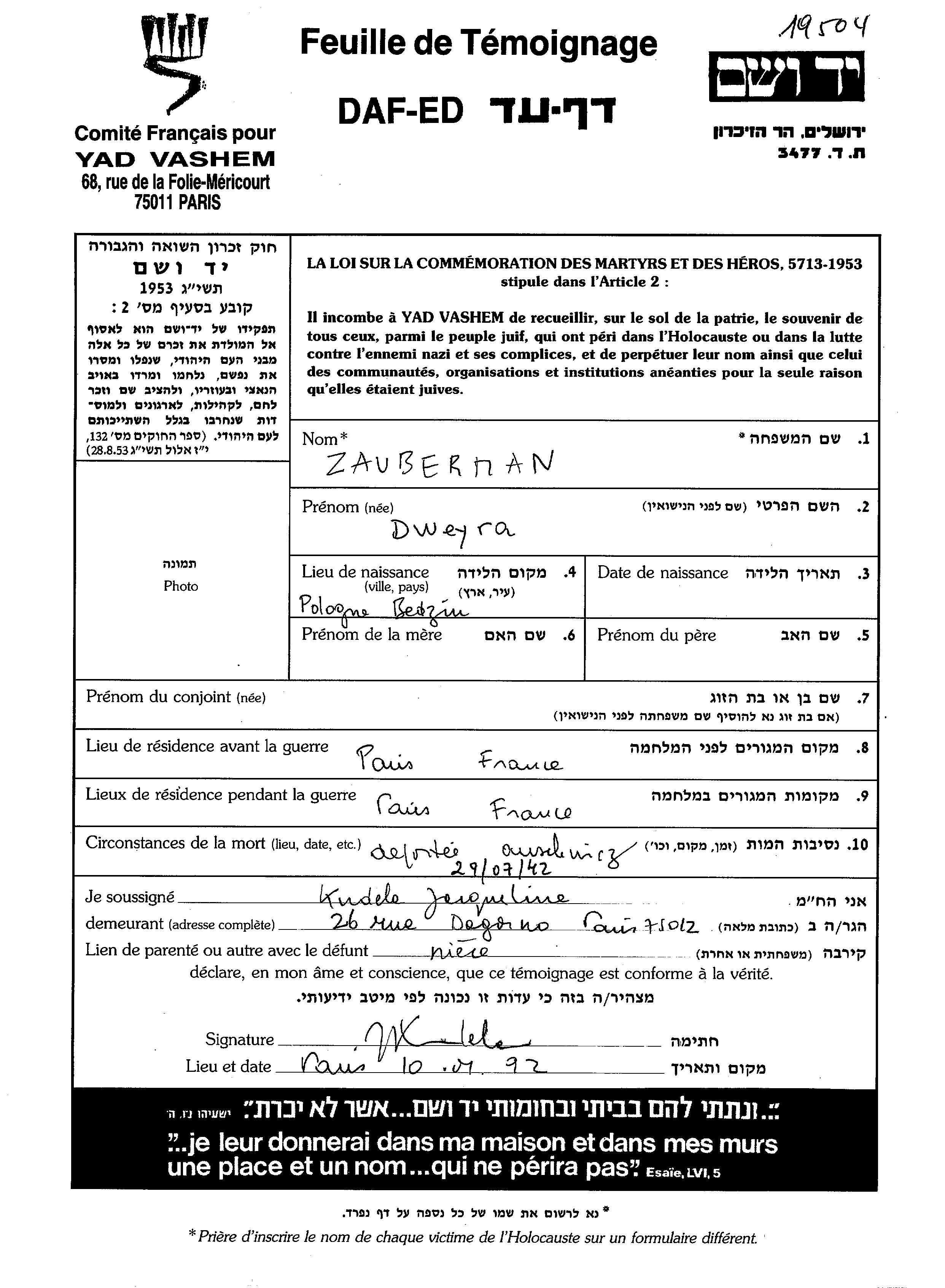 Dweyra זאוברמן נולדה בBędzin שבפולין. לפני מלחמת העולם השניה התגוררה בParis שבצרפת. בזמן המלחמה היא היתה בParis שבצרפת.