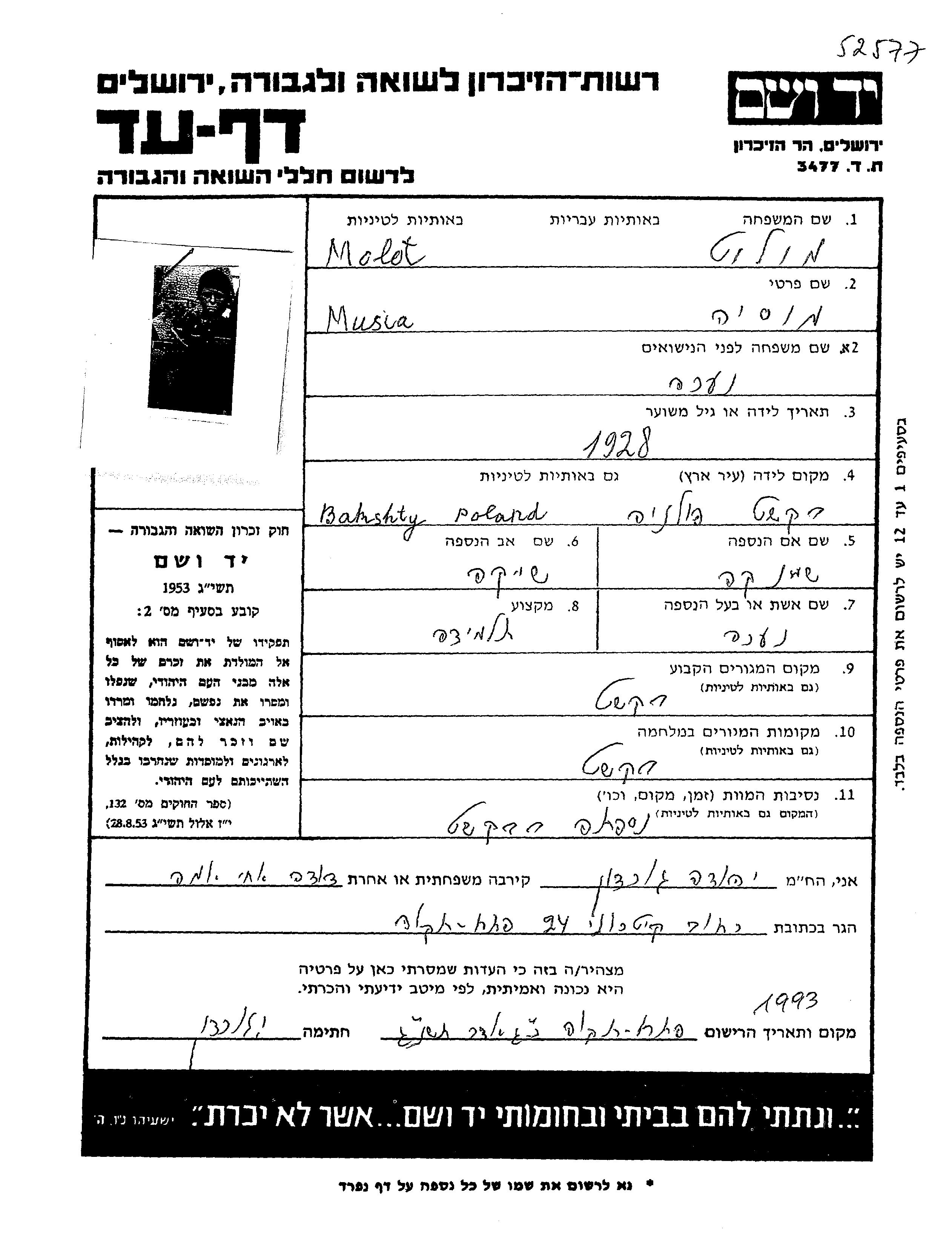 מוסיה מולוט נולדה בBakszty שבפולין בשנת 1928. היא היתה תלמידה. לפני מלחמת העולם השניה התגוררה בBakszty שבפולין.