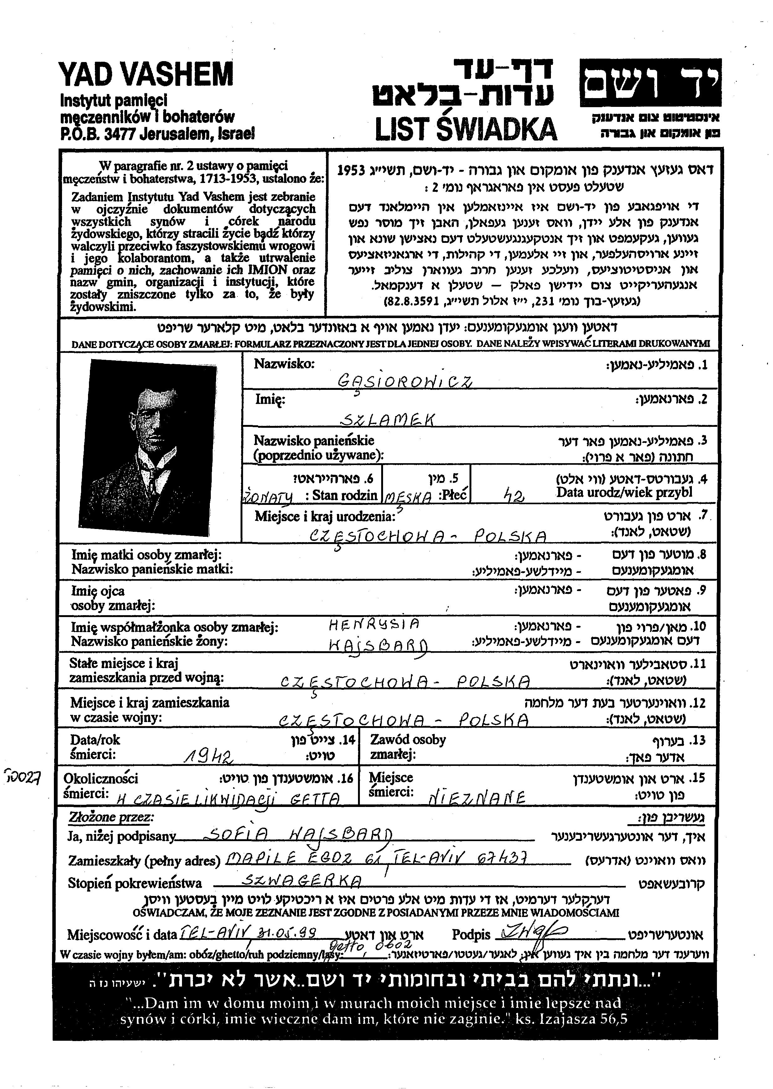 Szlamek Gasiorowicz נולד בCzestochowa שבפולין. לפני מלחמת העולם השניה התגורר בCzestochowa שבפולין.