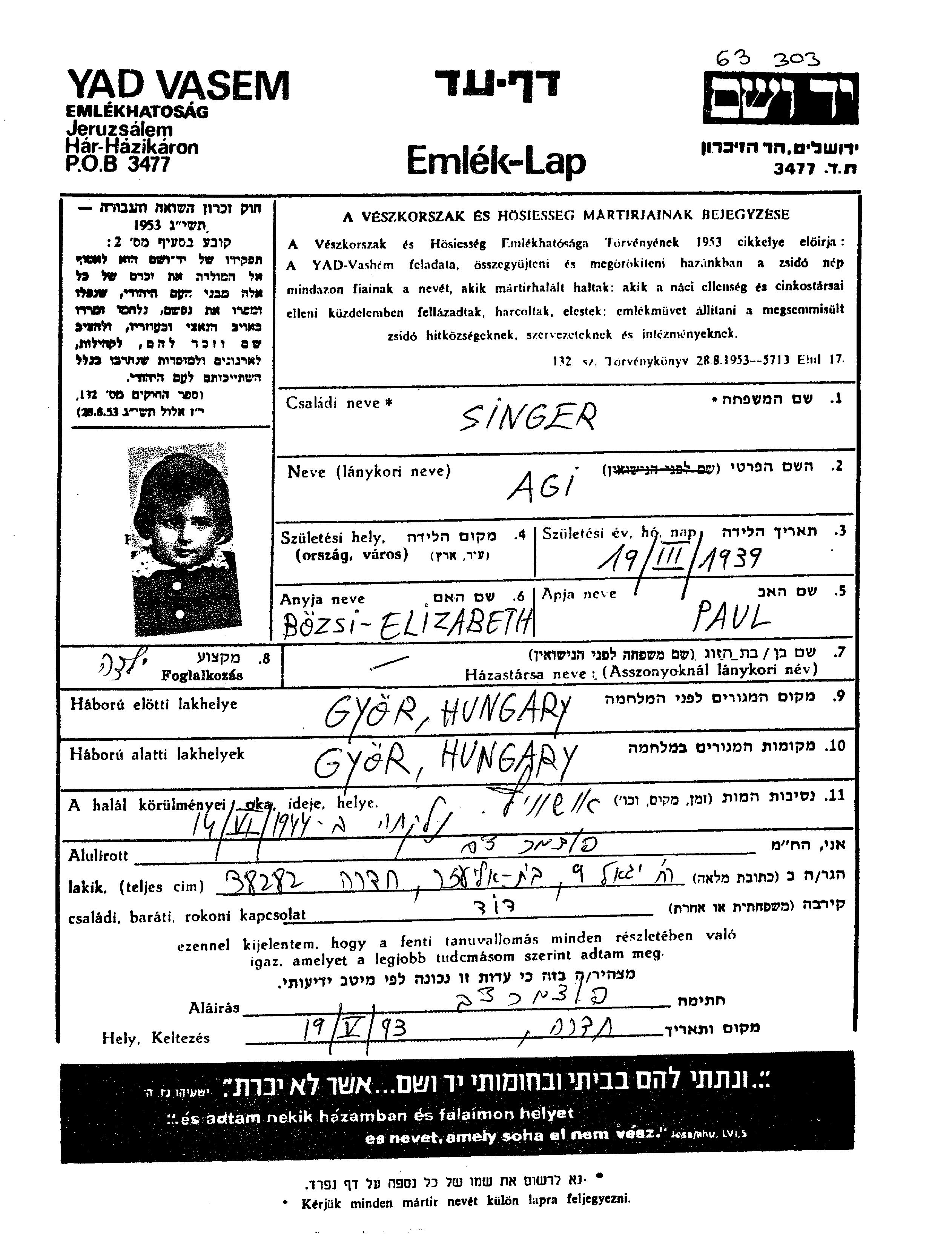Agi Singer נולדה בשנת 1939. לפני מלחמת העולם השניה התגוררה בGyor שבהונגריה.