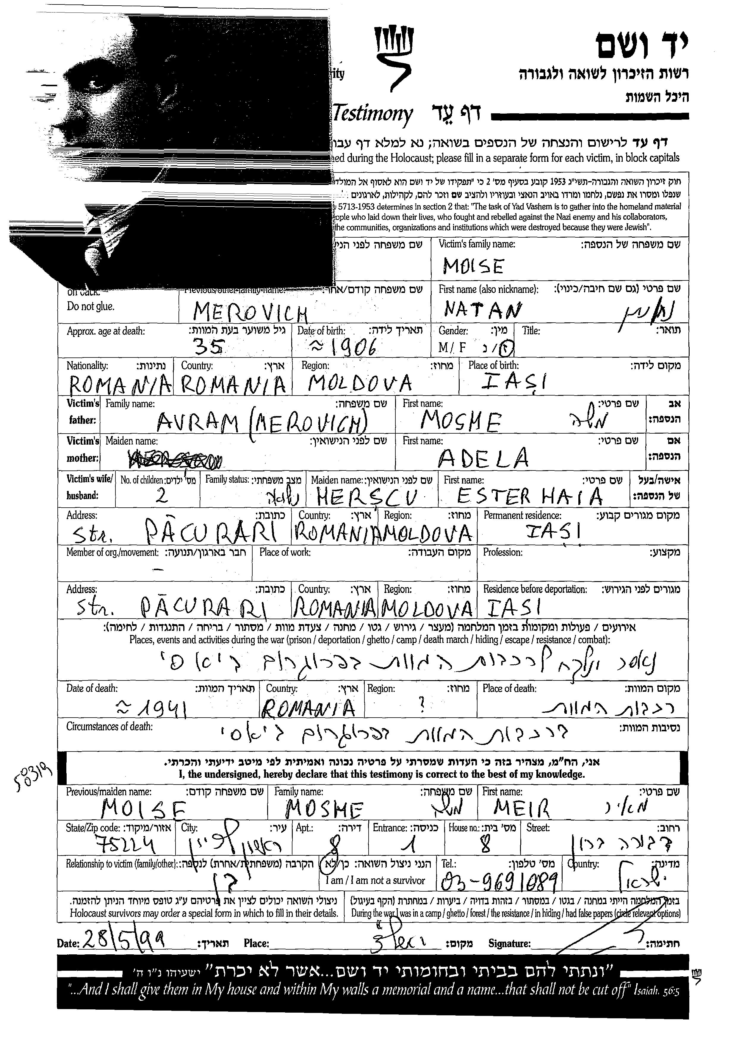 נתן מויסה נולד בIasi שברומניה בשנת 1906. לפני מלחמת העולם השניה התגורר בIasi שברומניה.
