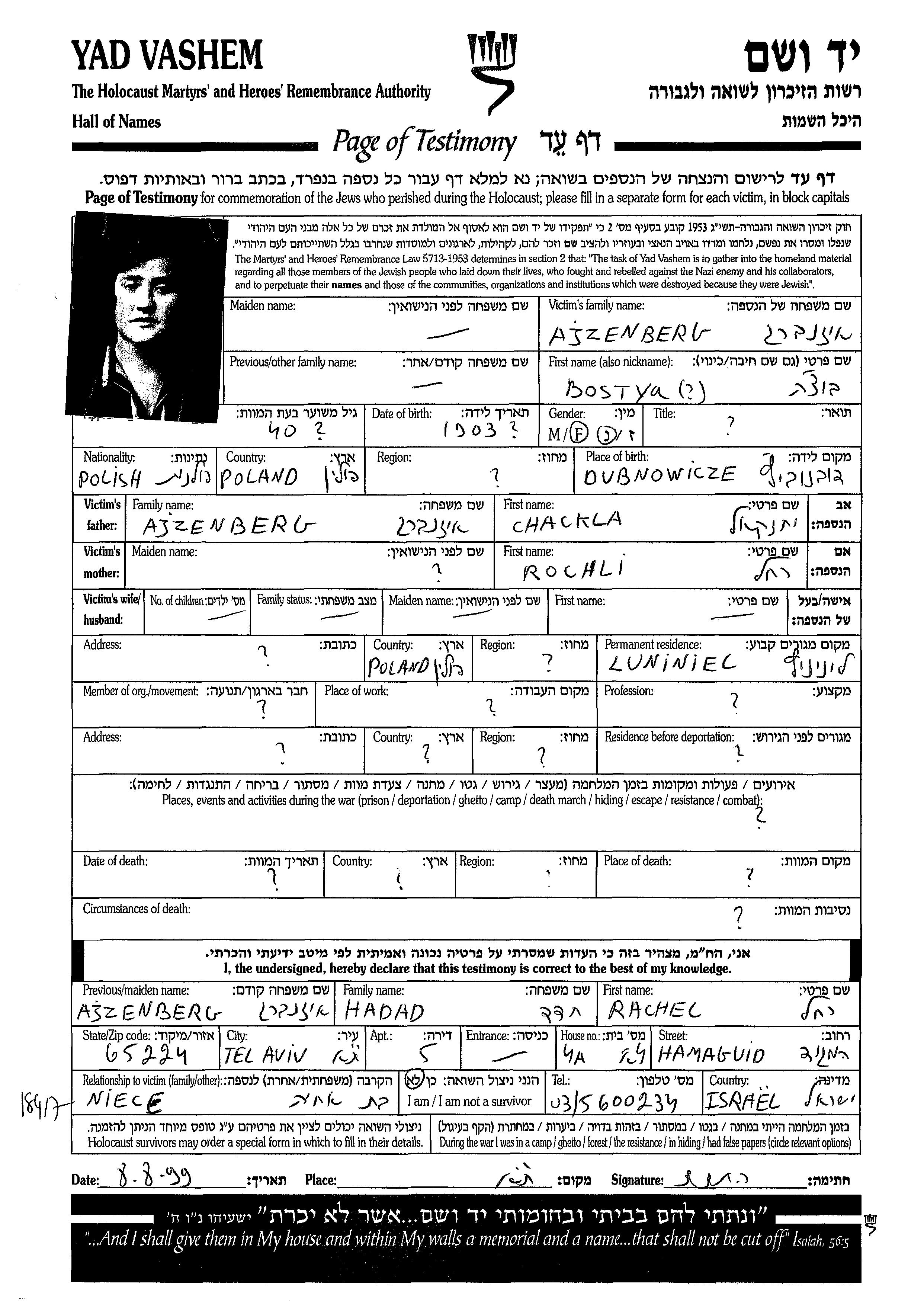 Bostya בוצה Ajzenberg נולדה בDubnowicze שבפולין בשנת 1903. לפני מלחמת העולם השניה התגוררה בLuniniec שבפולין.