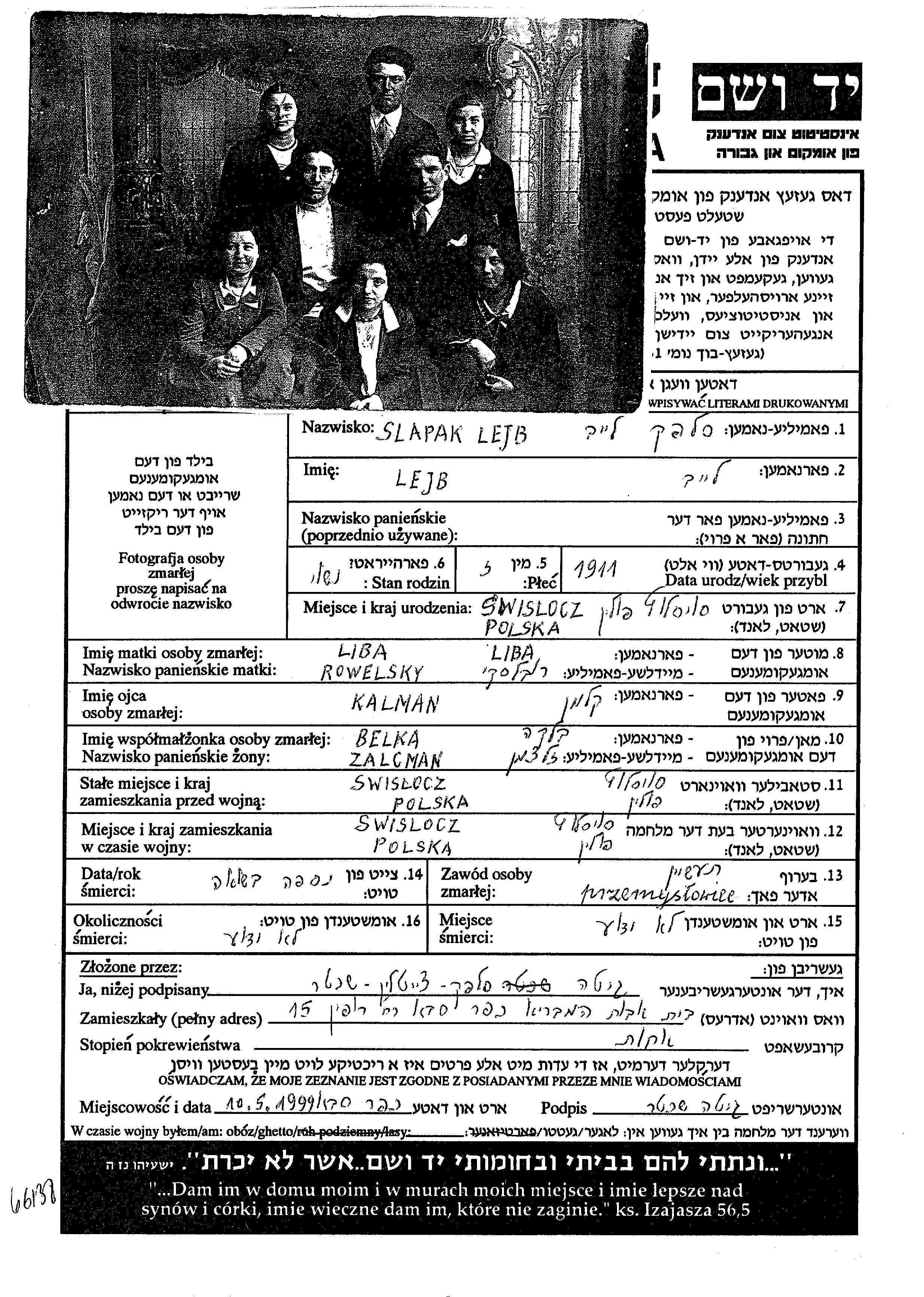 Lejb Slapak נולד בSwislocz שבפולין בשנת 1911. הוא היה תעשיין. לפני מלחמת העולם השניה התגורר בSwislocz שבפולין.