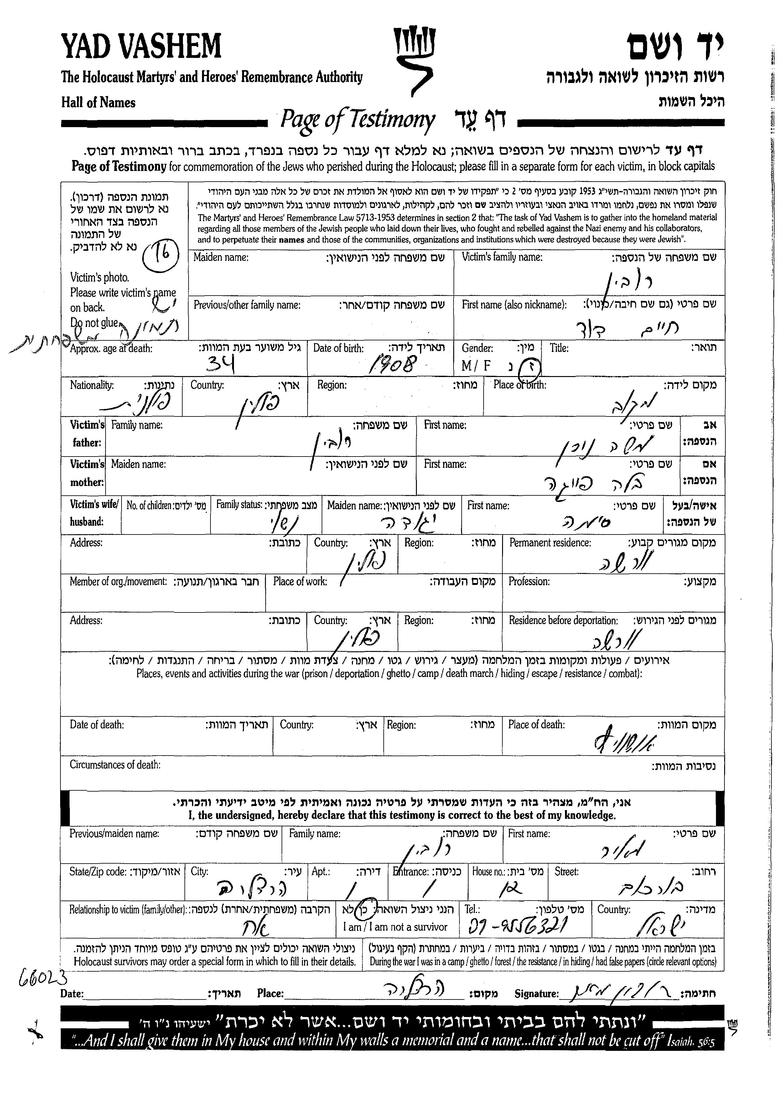 חיים דוד נרצח בשואה. מקום המוות: Auschwitz שבפולין.