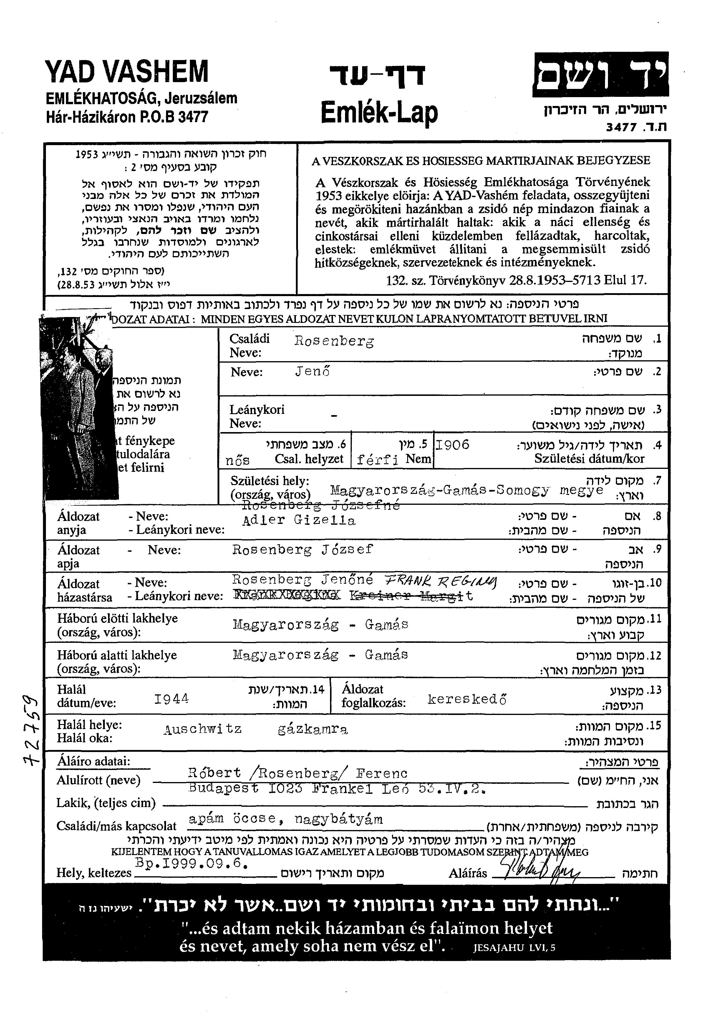 Jeno Rosenberg נולד בGamas שבהונגריה בשנת 1906. הוא היה סוחר. לפני מלחמת העולם השניה התגורר בGamas שבהונגריה.