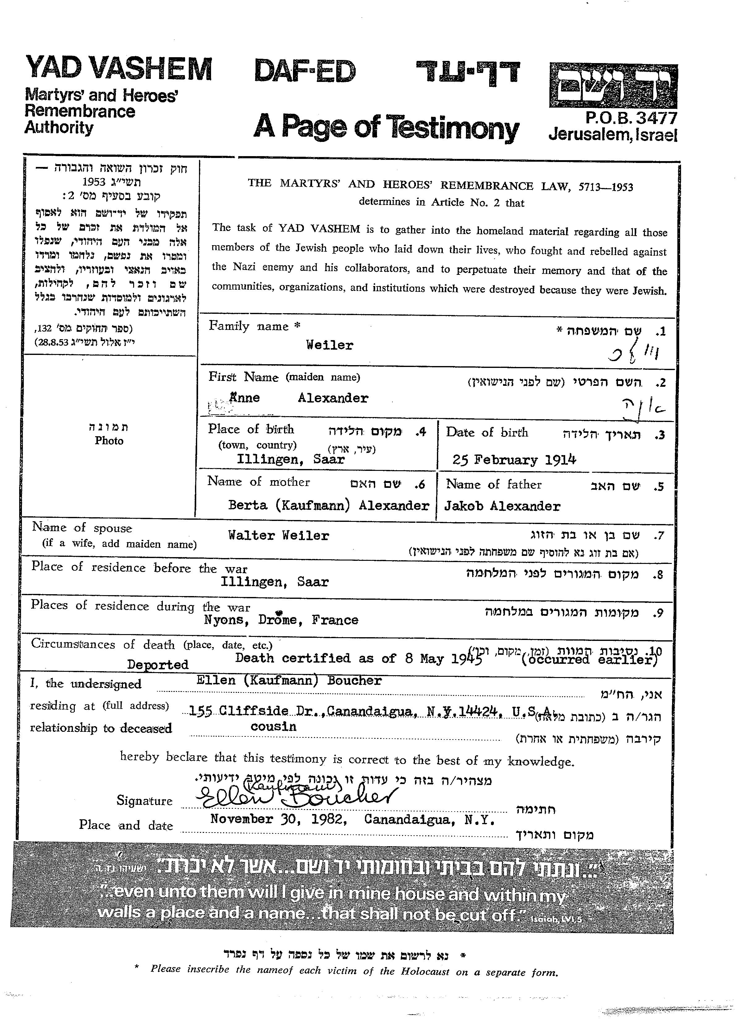 Anne Weiler לבית Alexander נולדה בIllingen שבגרמניה בשנת 1914. לפני מלחמת העולם השניה התגוררה בIllingen שבגרמניה.