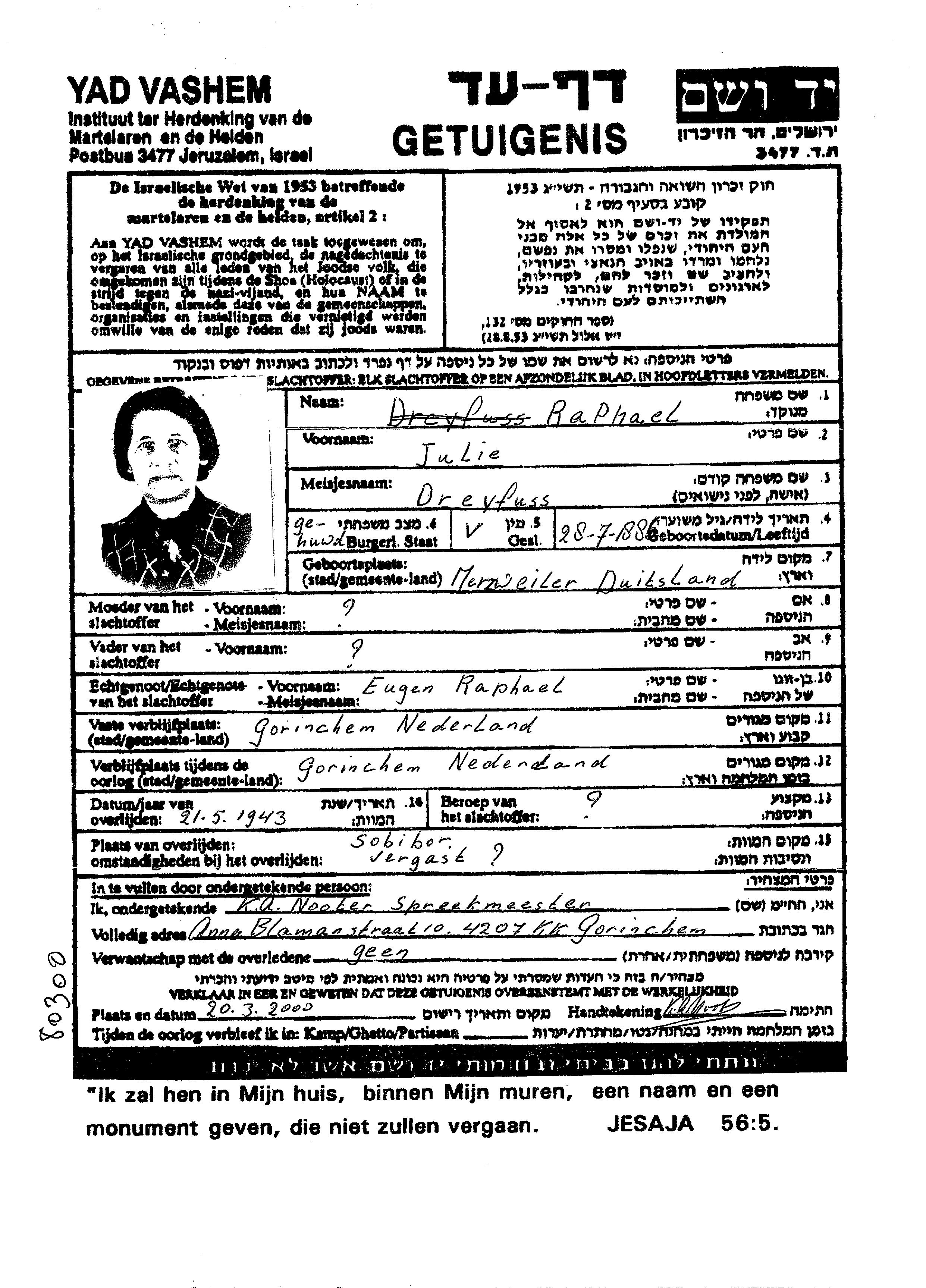 Julie Raphael לבית Dreyfuss נולדה בMertzwiller שבצרפת בשנת 1886. לפני מלחמת העולם השניה התגוררה בGorinchem שבהולנד.
