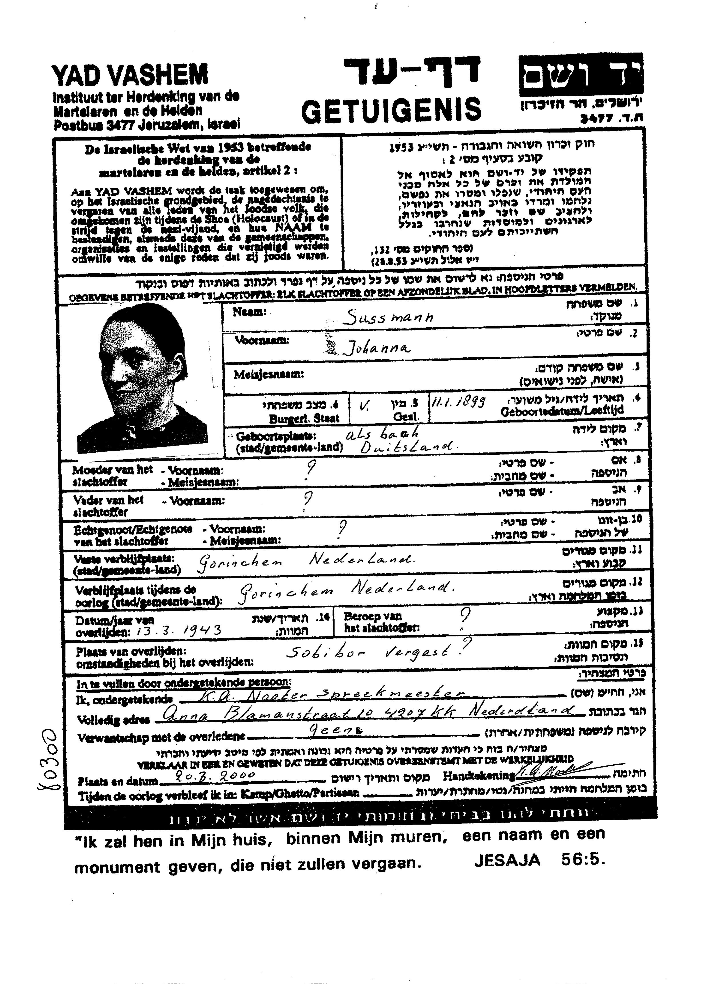 Johanna Sussman נולדה בAlsbach שבגרמניה בשנת 1899. לפני מלחמת העולם השניה התגוררה בGorinchem שבהולנד.