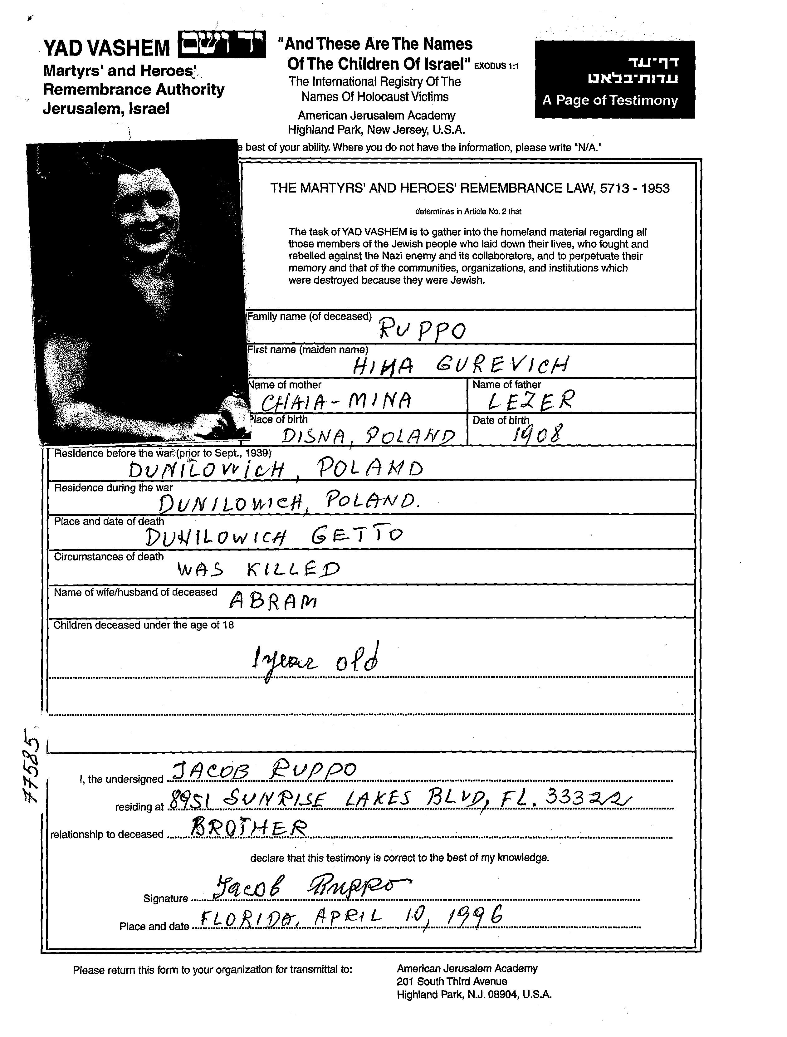 Hina Gurevich לבית Ruppo נולדה בDzisna שבפולין בשנת 1908. לפני מלחמת העולם השניה התגוררה בDunilowicze שבפולין.