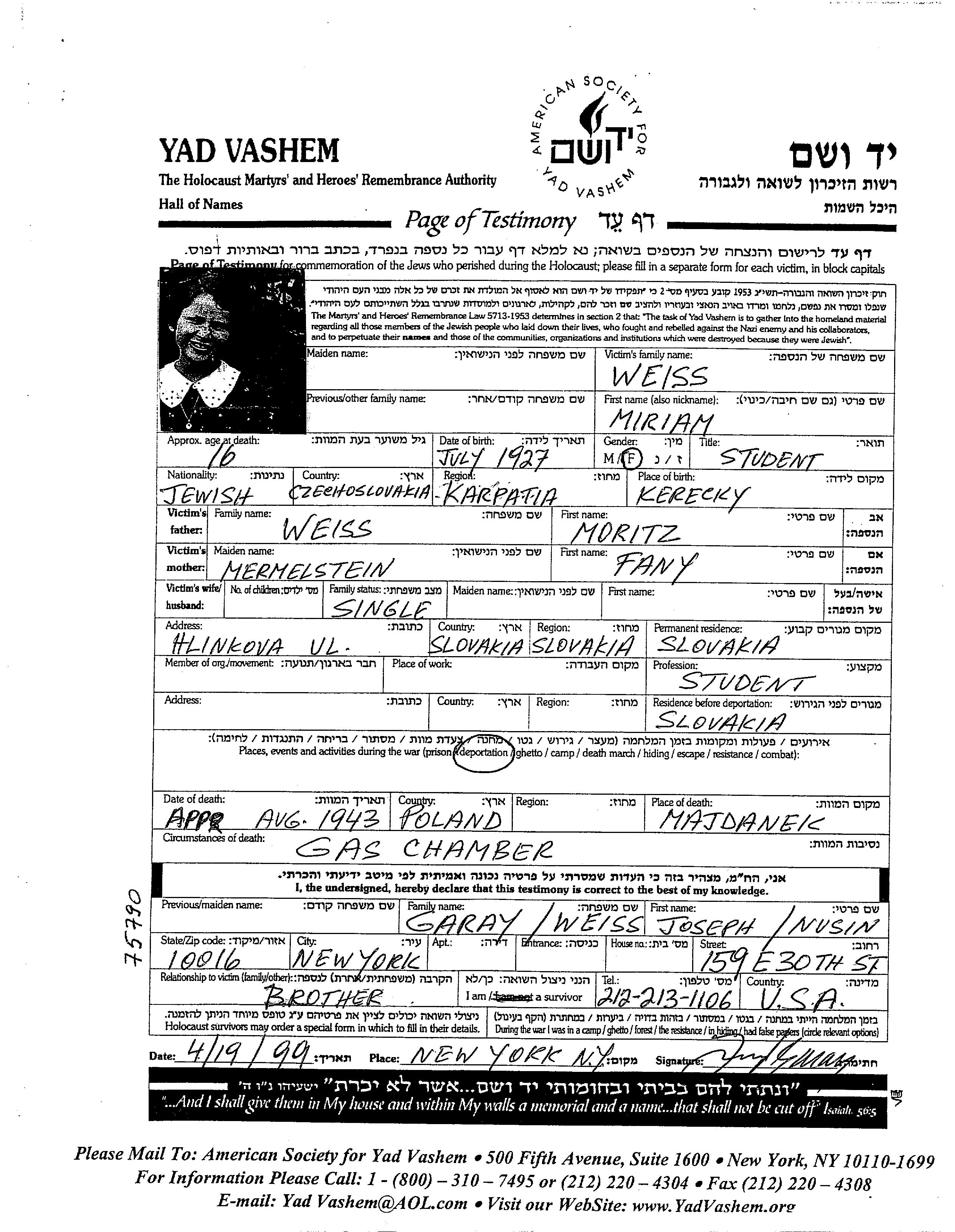 מרים Weiss נולדה בKerecky שבצ'כוסלובקיה בשנת 1927. היא היתה סטודנטית. לפני מלחמת העולם השניה התגוררה בSlovakia שבצ'כוסלובקיה.