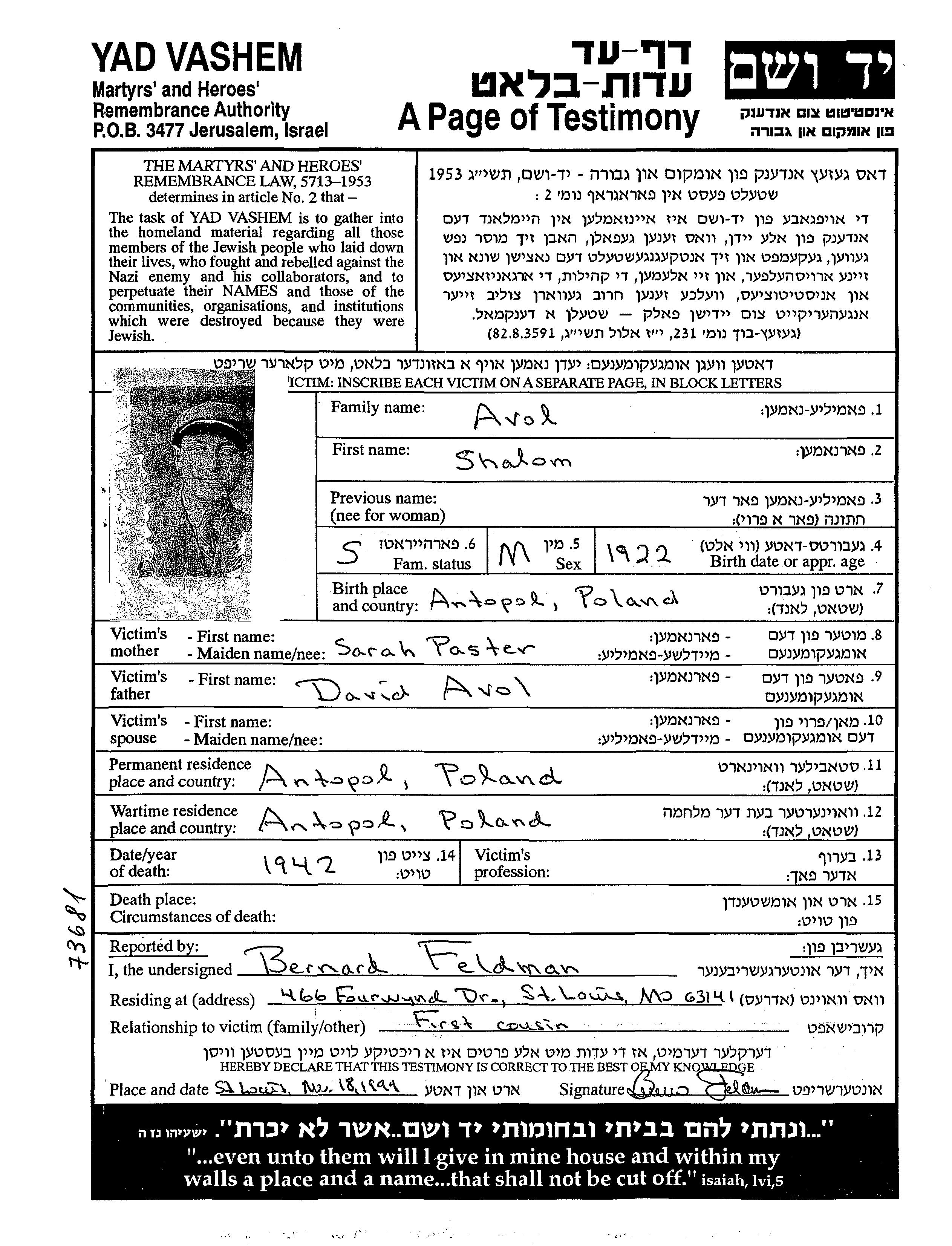 שלום Arol נולד בAntopol שבפולין בשנת 1922. לפני מלחמת העולם השניה התגורר בAntopol שבפולין.