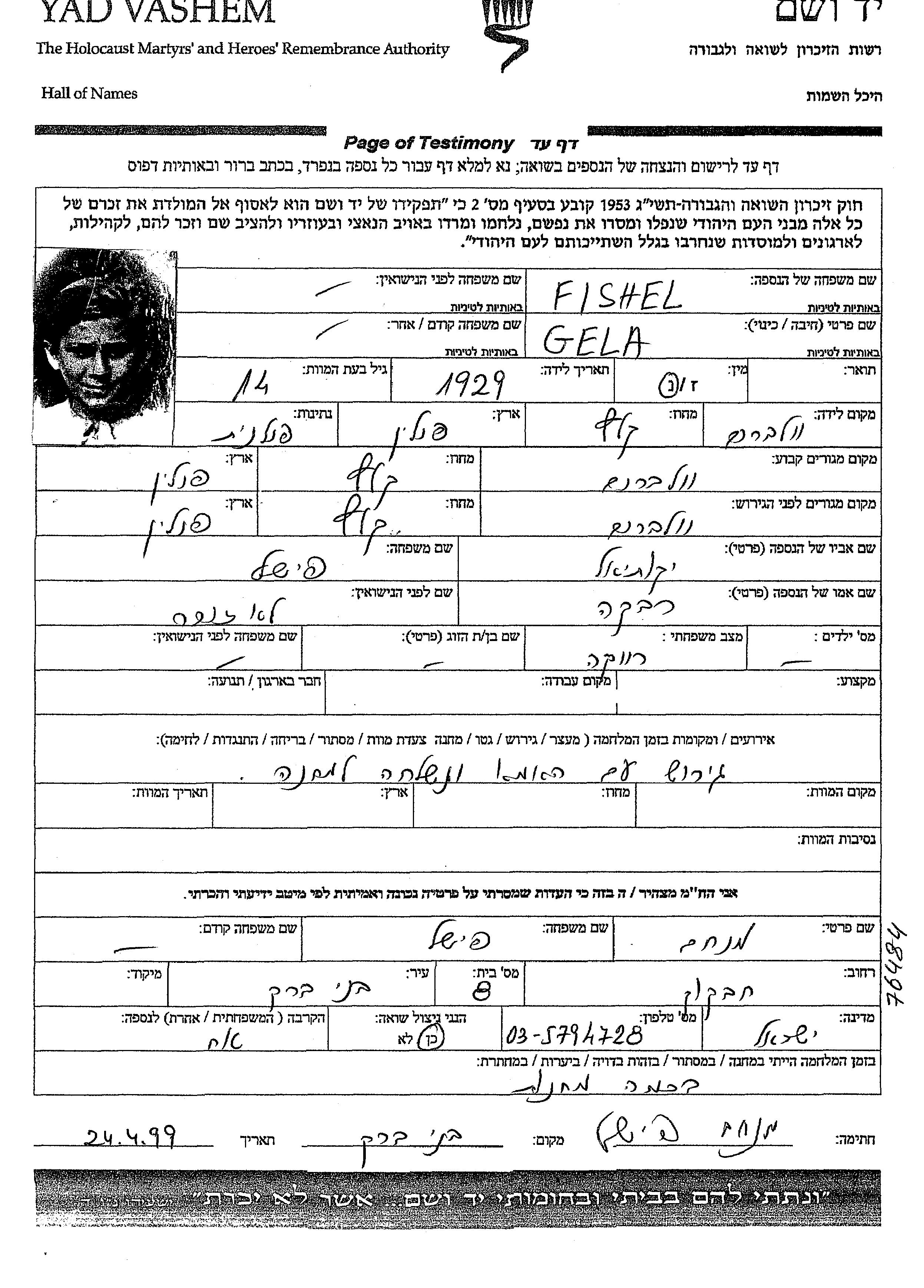פישל גלה 1929 Wolbrom, פולין דף-עד