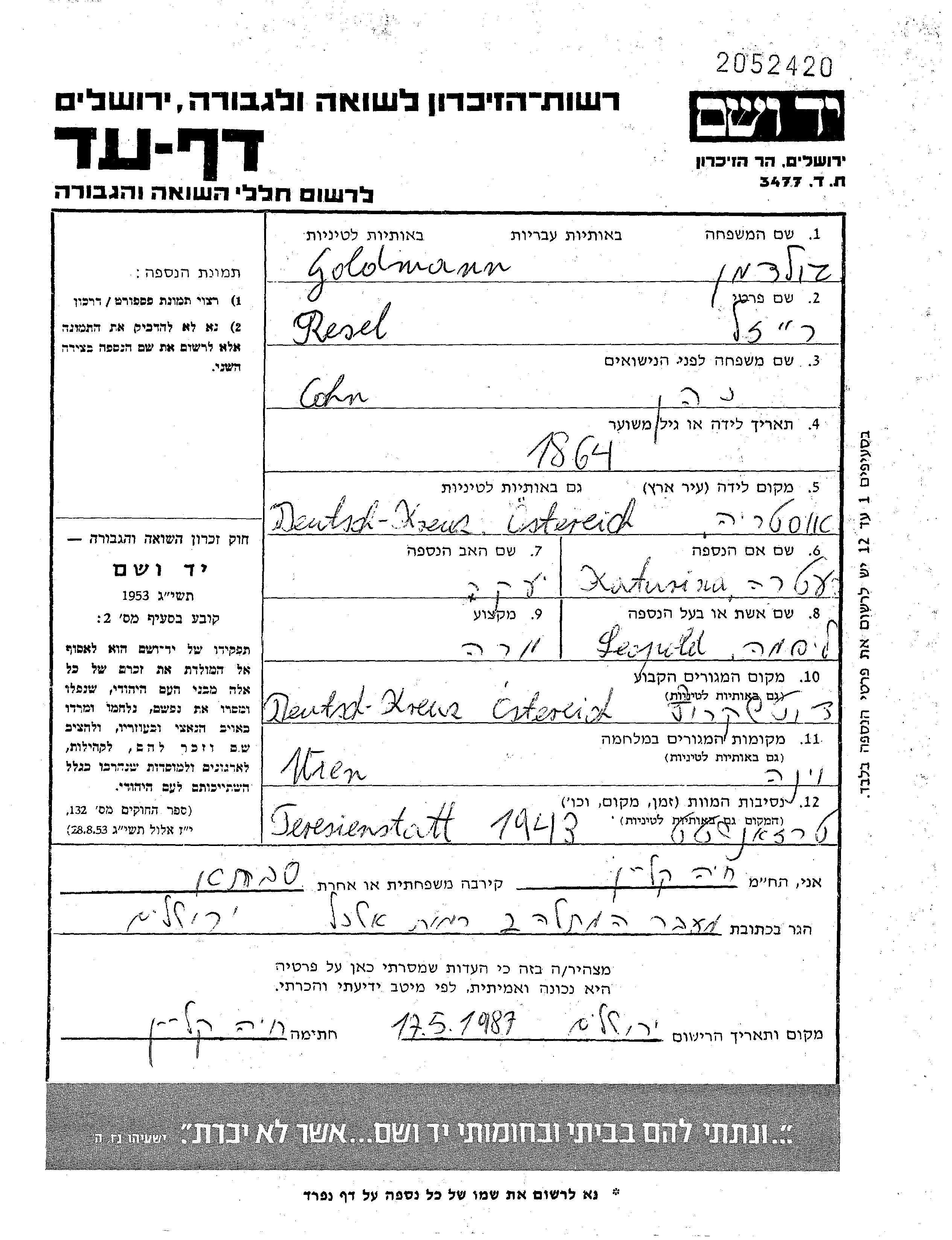 היא נרצחה בשואה. מקום המוות: Theresienstadt שבצ'כוסלובקיה בשנת 15/12/1942.