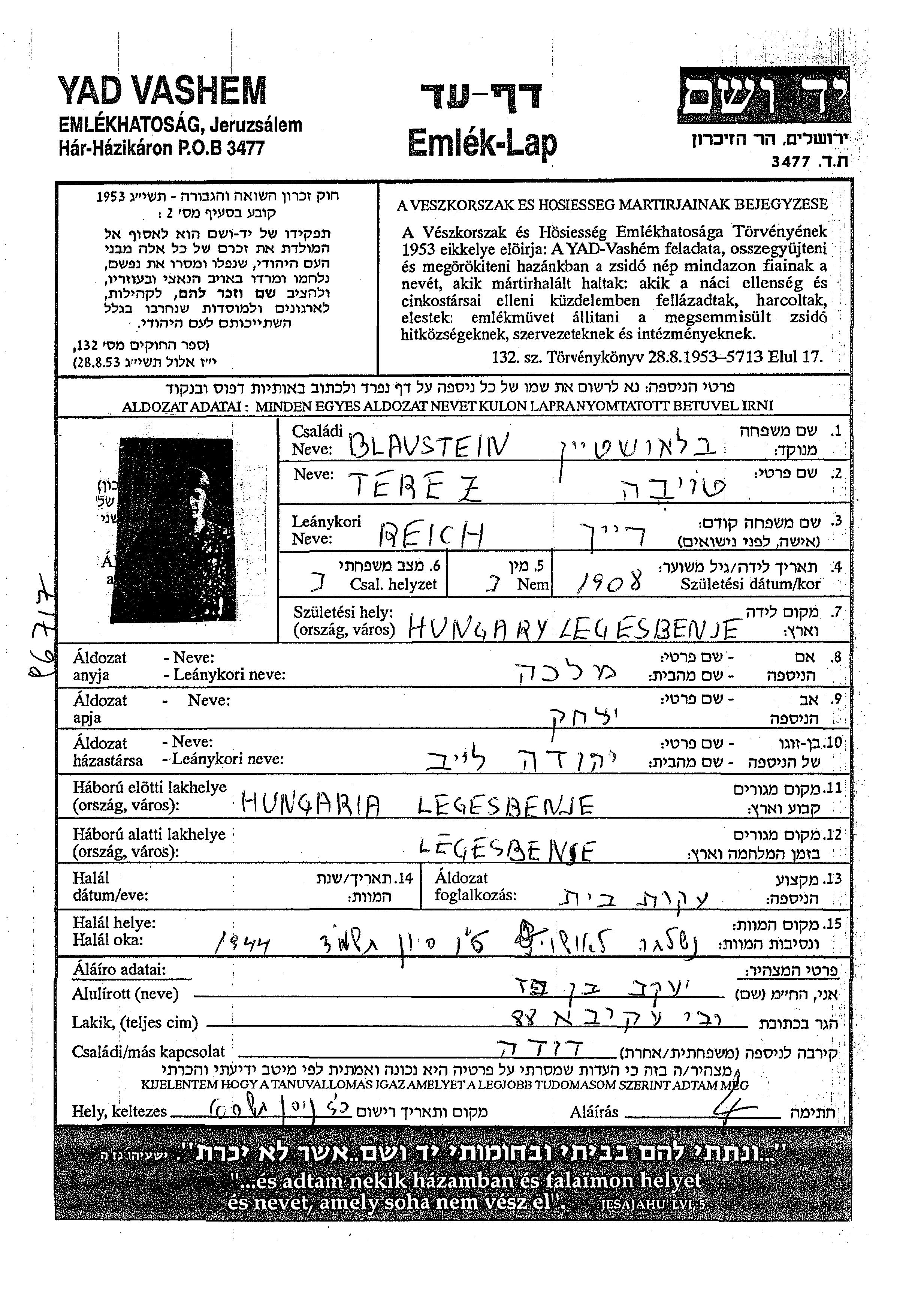 Terez טויבה Blaustein לבית Reich נולדה בLegyesbenye שבהונגריה בשנת 1908. היא היתה עקרת בית. לפני מלחמת העולם השניה התגוררה בLegyesbenye שבהונגריה.