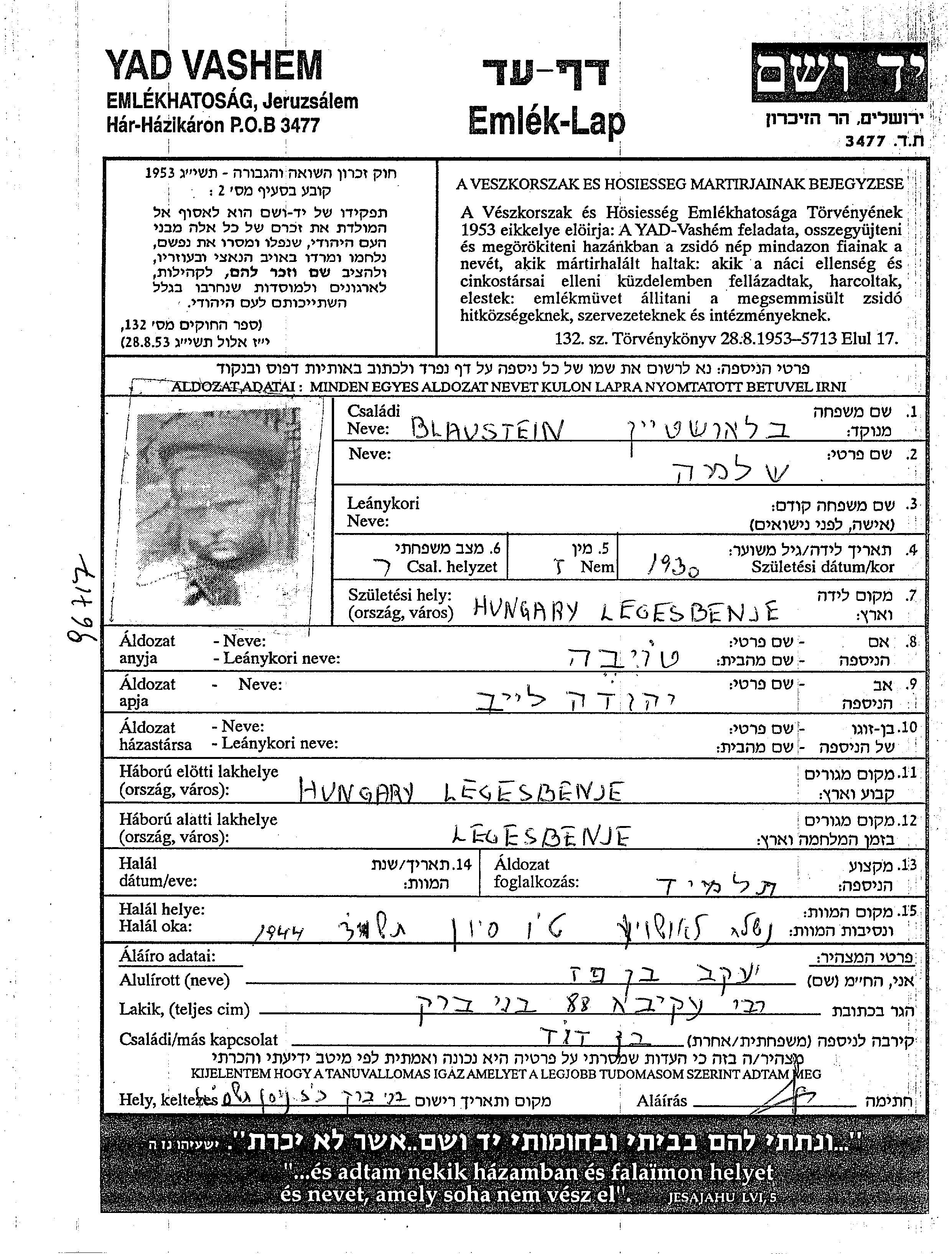 שלמה Blaustein נולד בLegyesbenye שבהונגריה בשנת 1930. הוא היה תלמיד. לפני מלחמת העולם השניה התגורר בLegyesbenye שבהונגריה.