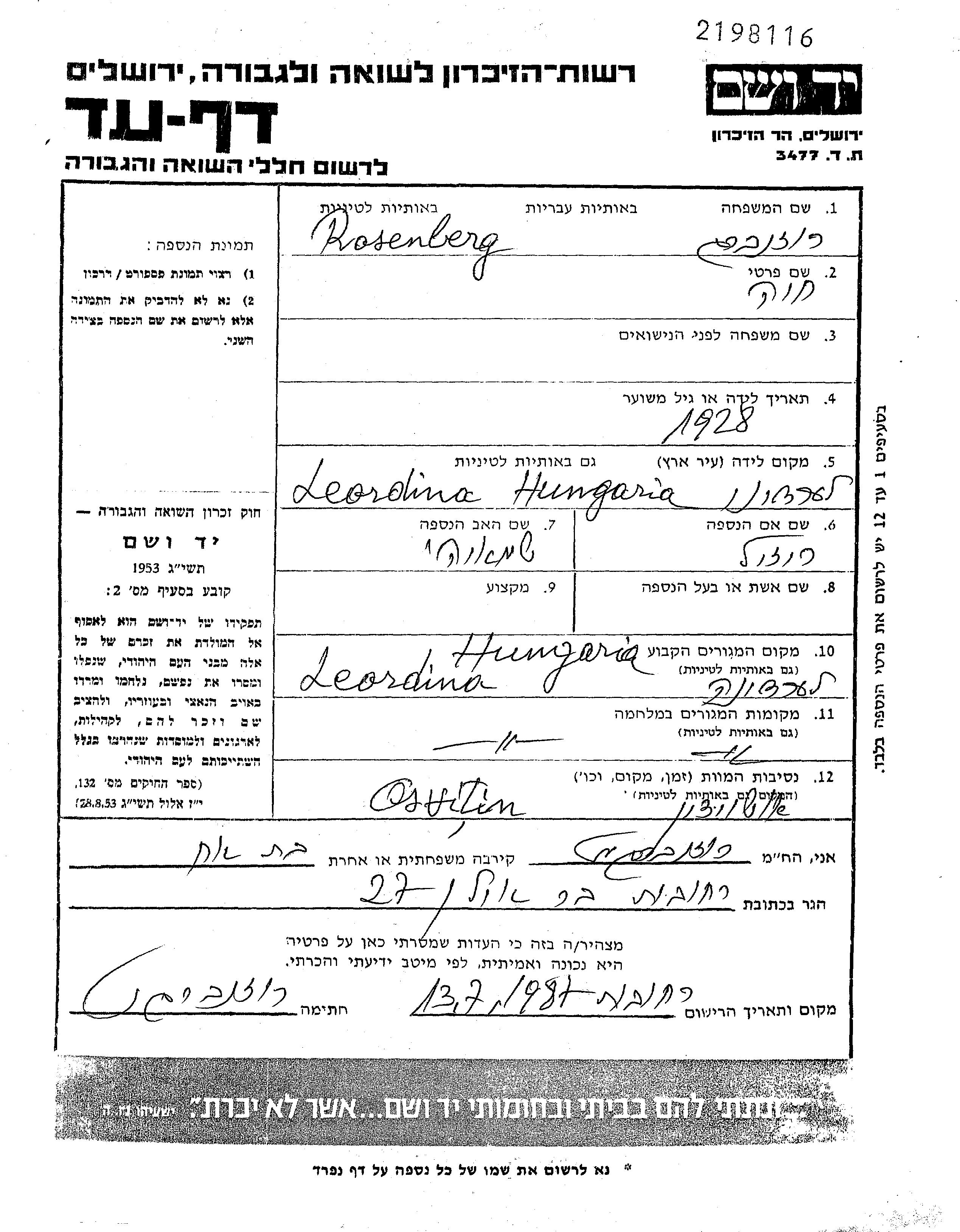 חיה Rosenberg נולדה בLeordina שברומניה בשנת 1928 לShmarie וRaizil לבית קליין. היא היתה ילדה. לפני מלחמת העולם השניה התגוררה בLeordina שברומניה. בזמן המלחמה היא היתה בLeordina שברומניה. חיה נרצחה בשואה. מקום המוות: Auschwitz שבפולין.