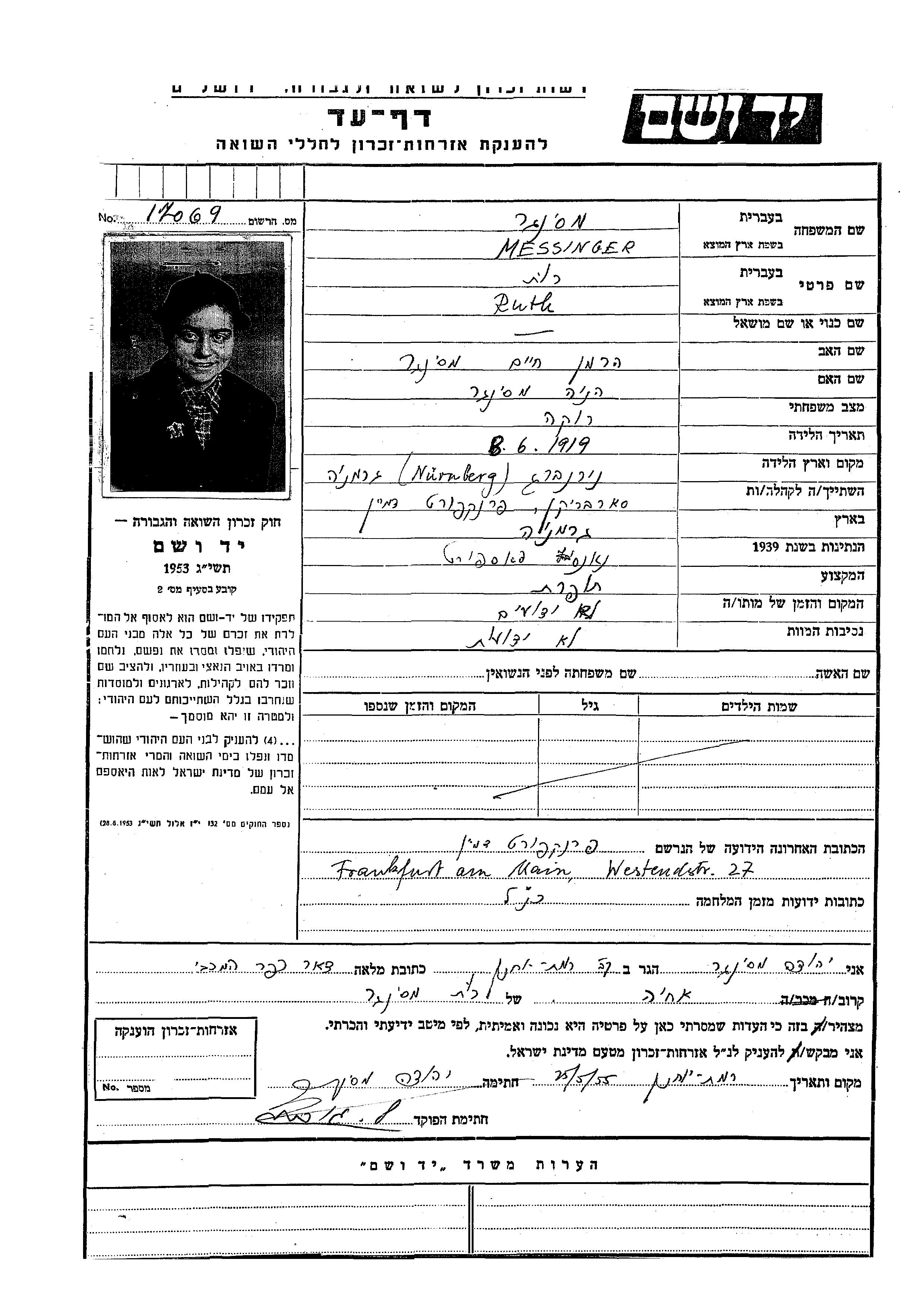 Ruth Messinger נולדה בNuernberg שבגרמניה בשנת 1919. היא היתה תופרת. לפני מלחמת העולם השניה התגוררה בFrankfurt שבגרמניה.