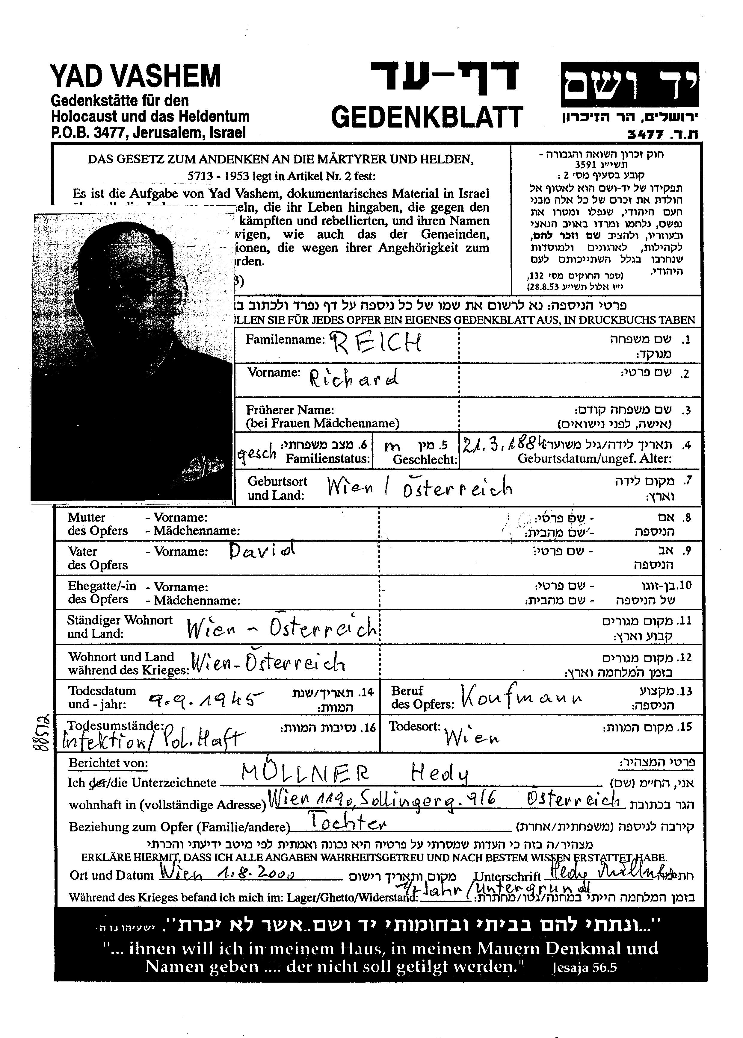 Richard Reich נולד בWien שבאוסטריה בשנת 1884. הוא היה סוחר. לפני מלחמת העולם השניה התגורר בWien שבאוסטריה.