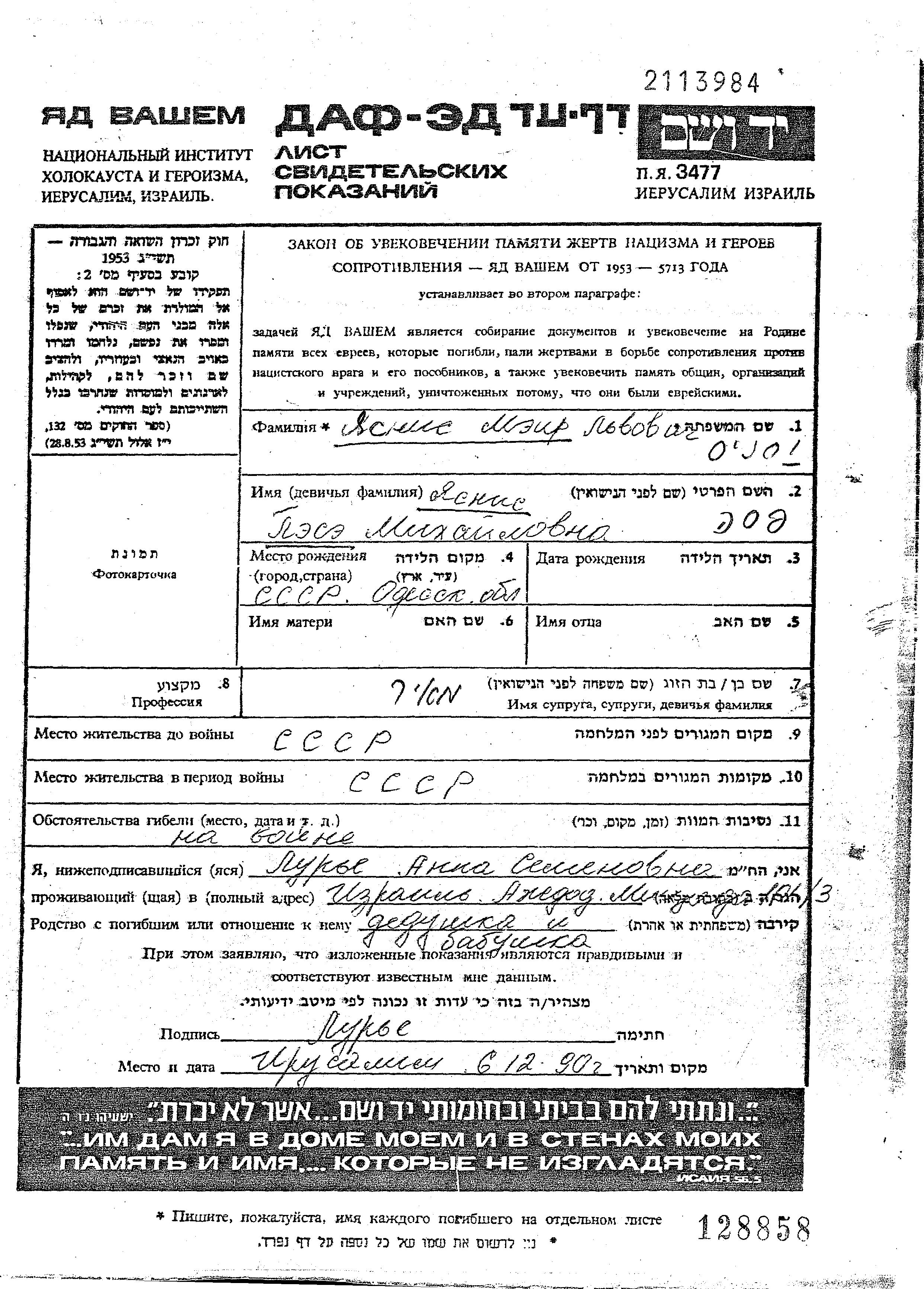 Pese פסה יסניס נולדה בOdessa שבאוקראינה (ברה"מ) לMikhail. היא היתה נשואה למאיר. לפני מלחמת העולם השניה התגוררה בברית המועצות. בזמן המלחמה היא היתה בברית המועצות. היא נרצחה בשואה.