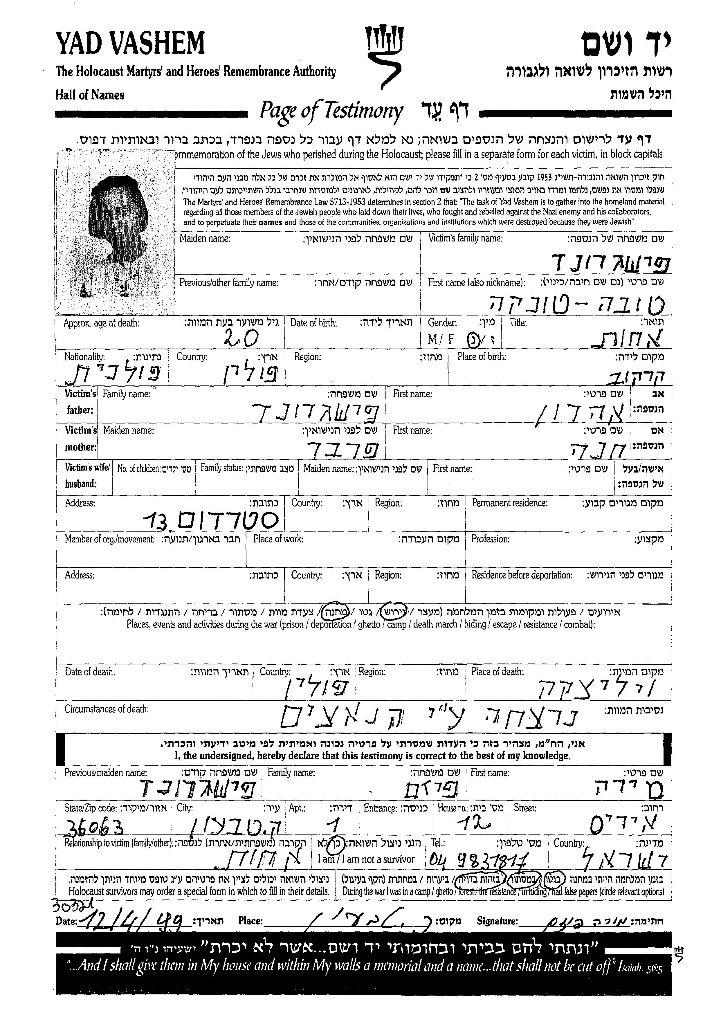 טובקה נרצחה בשואה. מקום המוות: Wieliczka שבפולין.