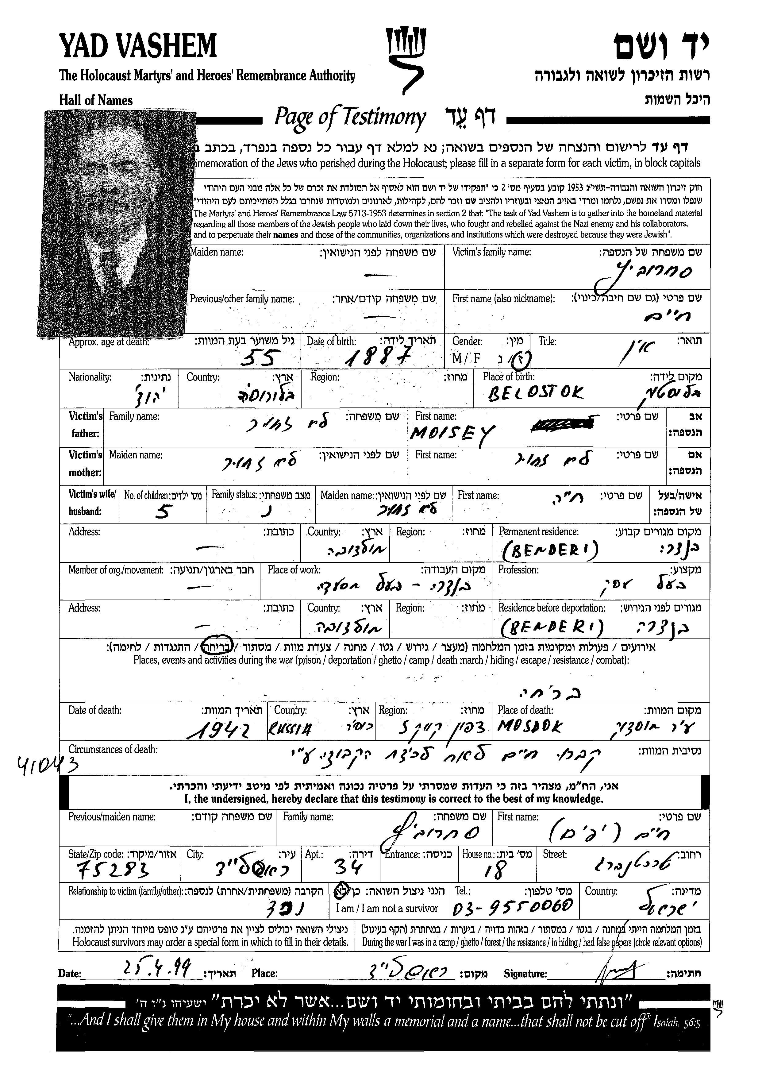 חיים נרצח בשואה. מקום המוות: Mozdok שברוסיה (ברה"מ) בשנת 1942.