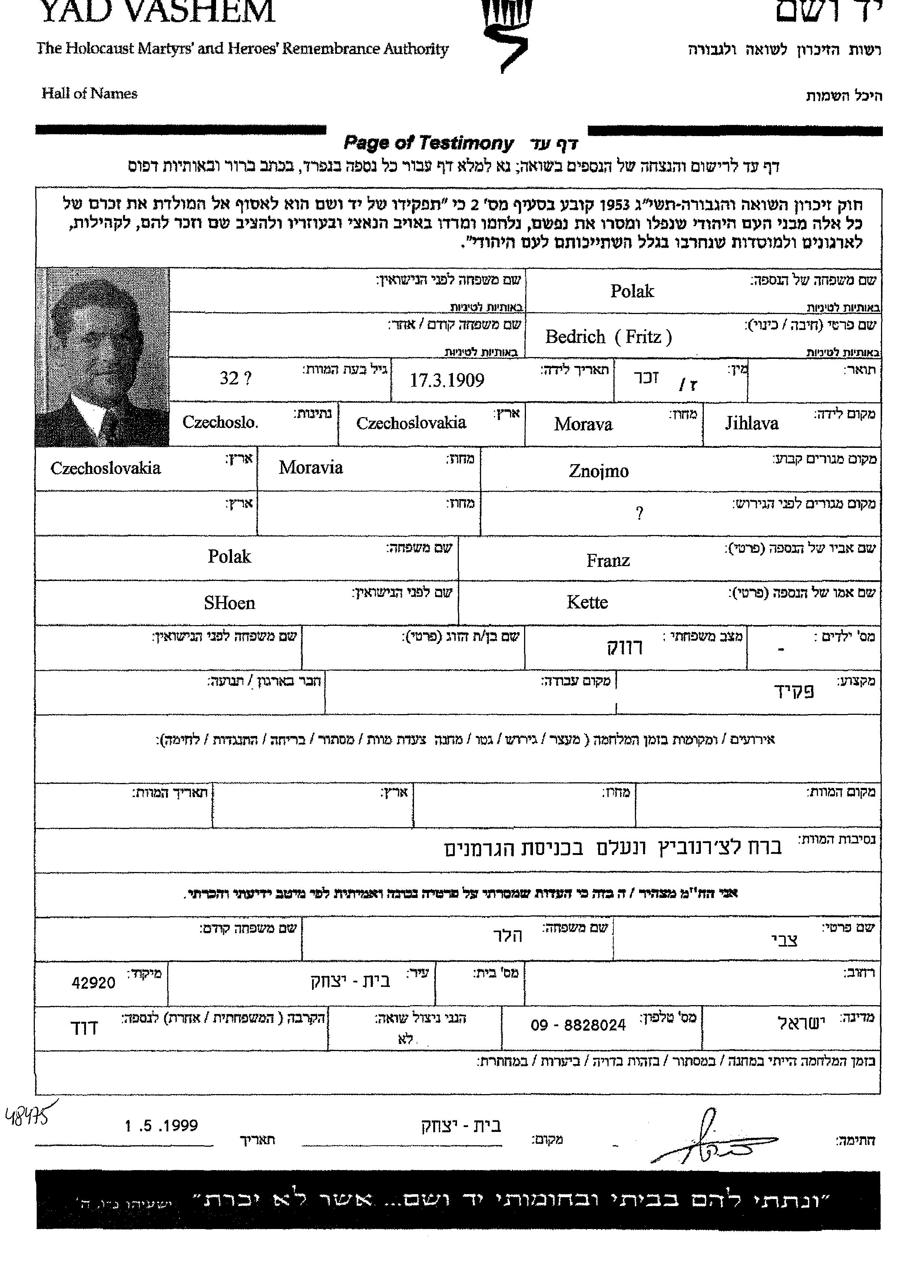 Fritz Bedrich פולק נולד בJihlava שבצ'כוסלובקיה בשנת 1909. הוא היה פקיד. לפני מלחמת העולם השניה התגורר בZnojmo שבצ'כוסלובקיה.