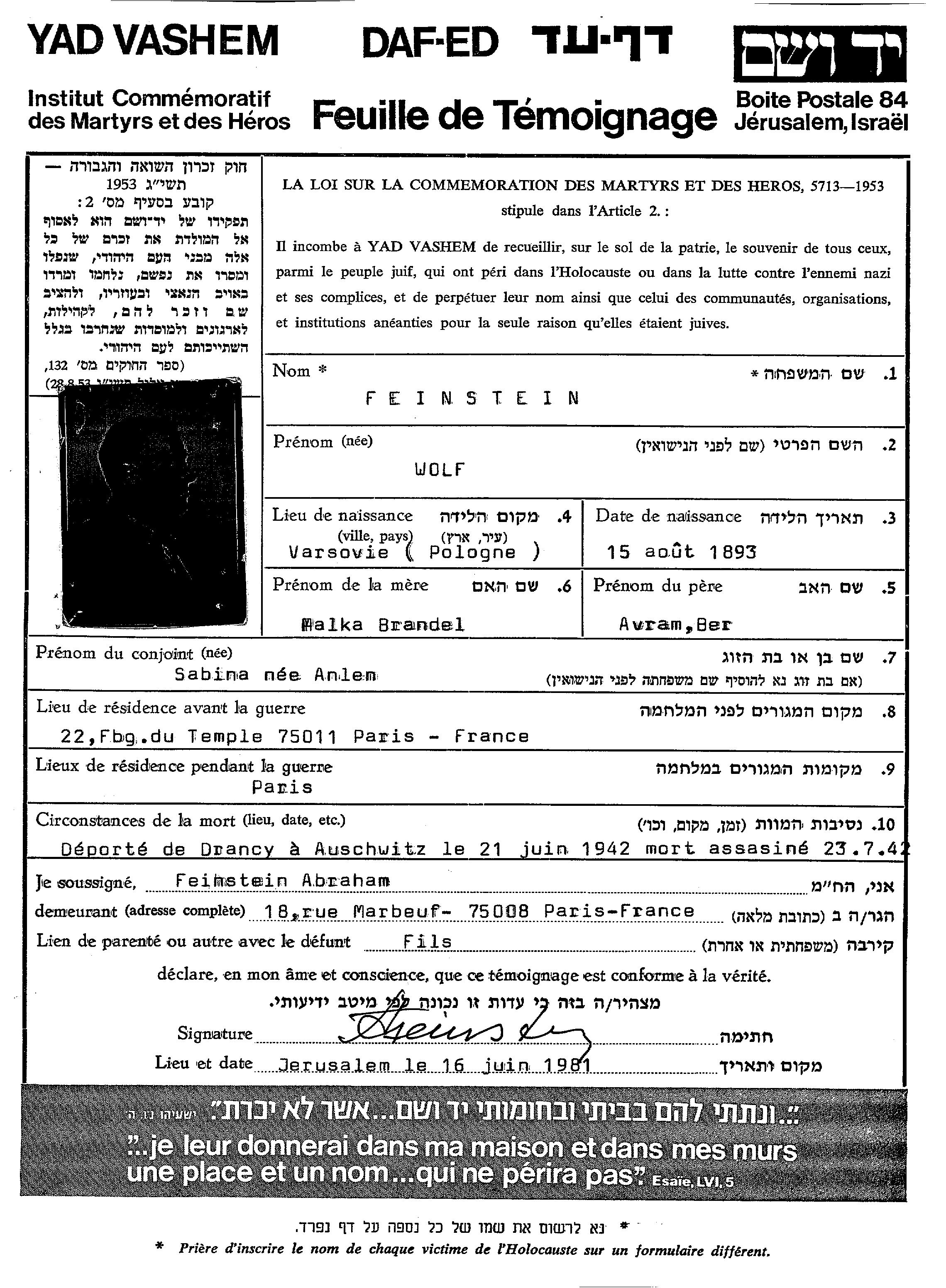 Wolf Feinstein נולד בWarszawa שבפולין בשנת 1893. לפני מלחמת העולם השניה התגורר בParis שבצרפת.