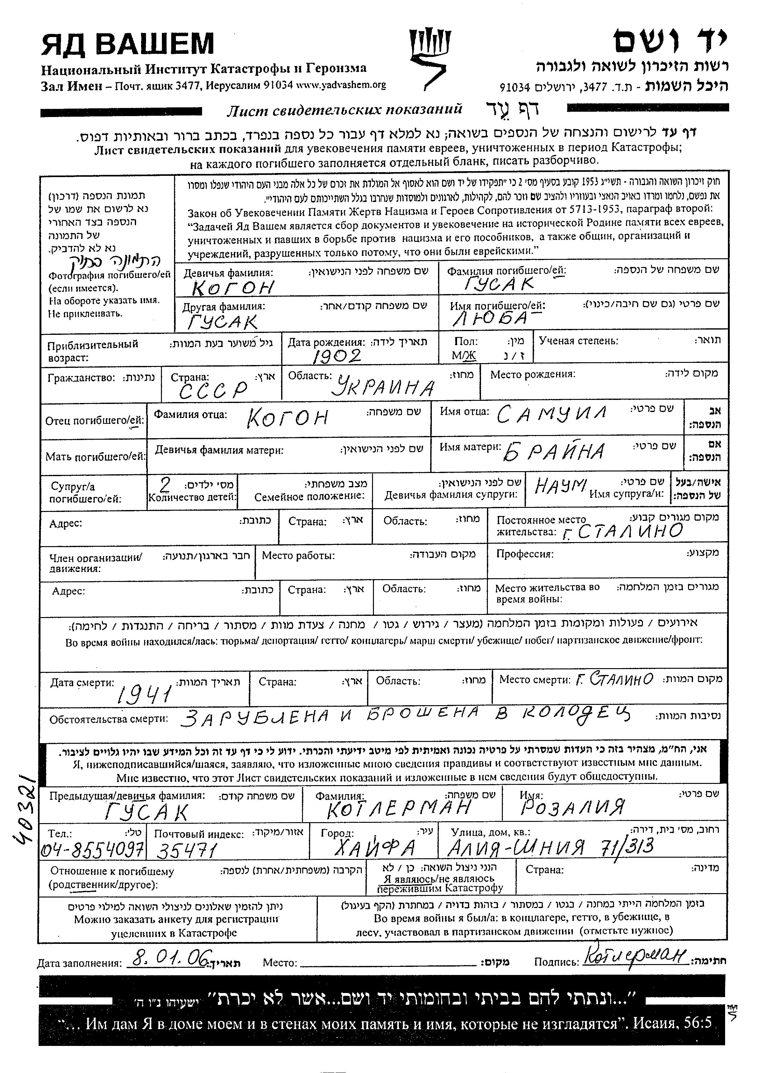 היא נרצחה בשואה. מקום המוות: Stalino שבאוקראינה (ברה"מ) בשנת 1941.