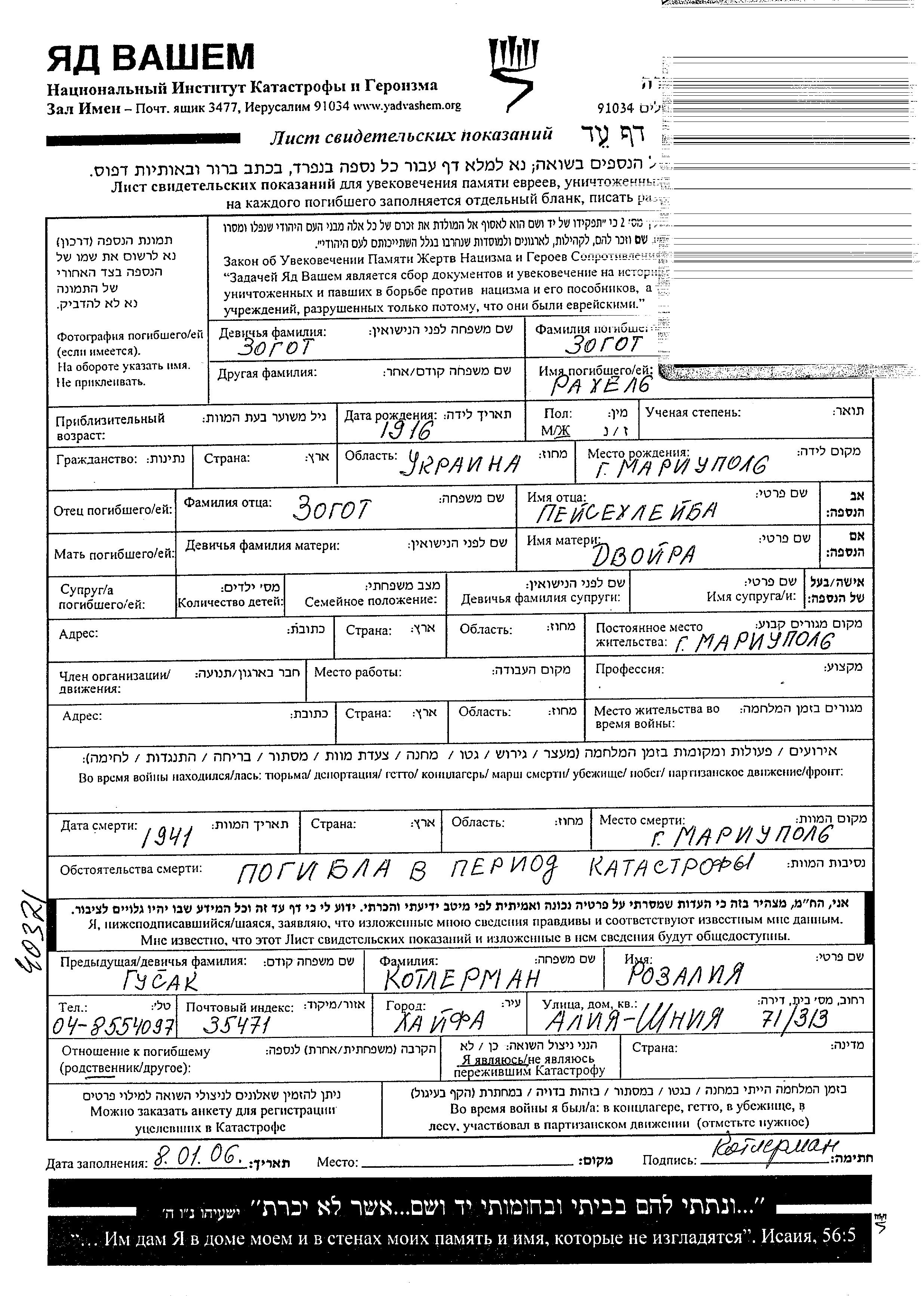 רחל נרצחה בשואה. מקום המוות: Mariupol שבאוקראינה (ברה"מ).
