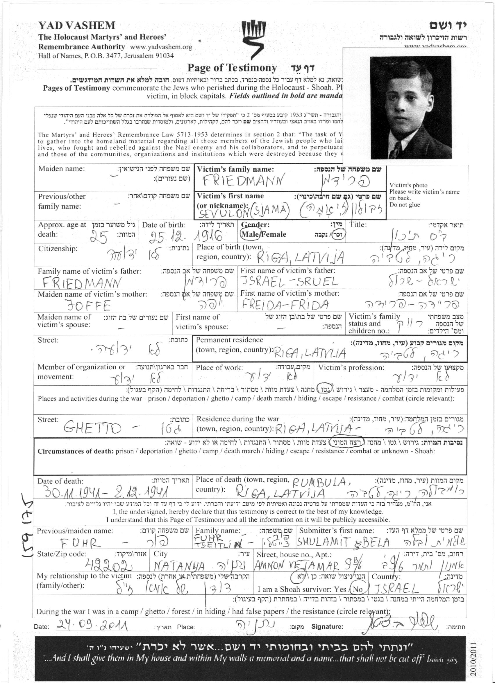 זבולון זיאמה נרצח בשואה. מקום המוות: Rumbuli שבלטביה בשנת 08/12/1941.