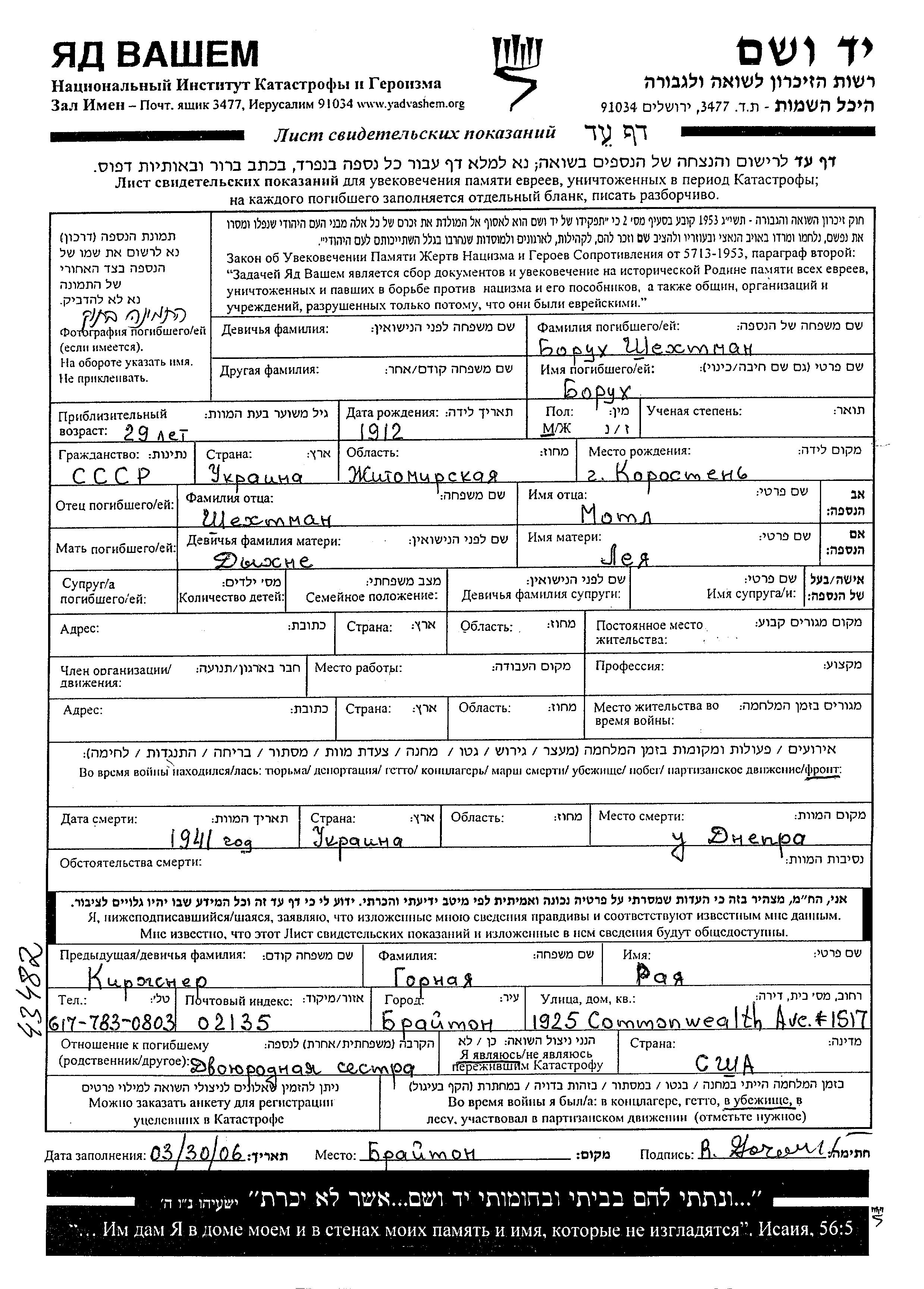 Borukh שכטמן נולד בKorosten שבאוקראינה (ברה"מ) בשנת 1912.