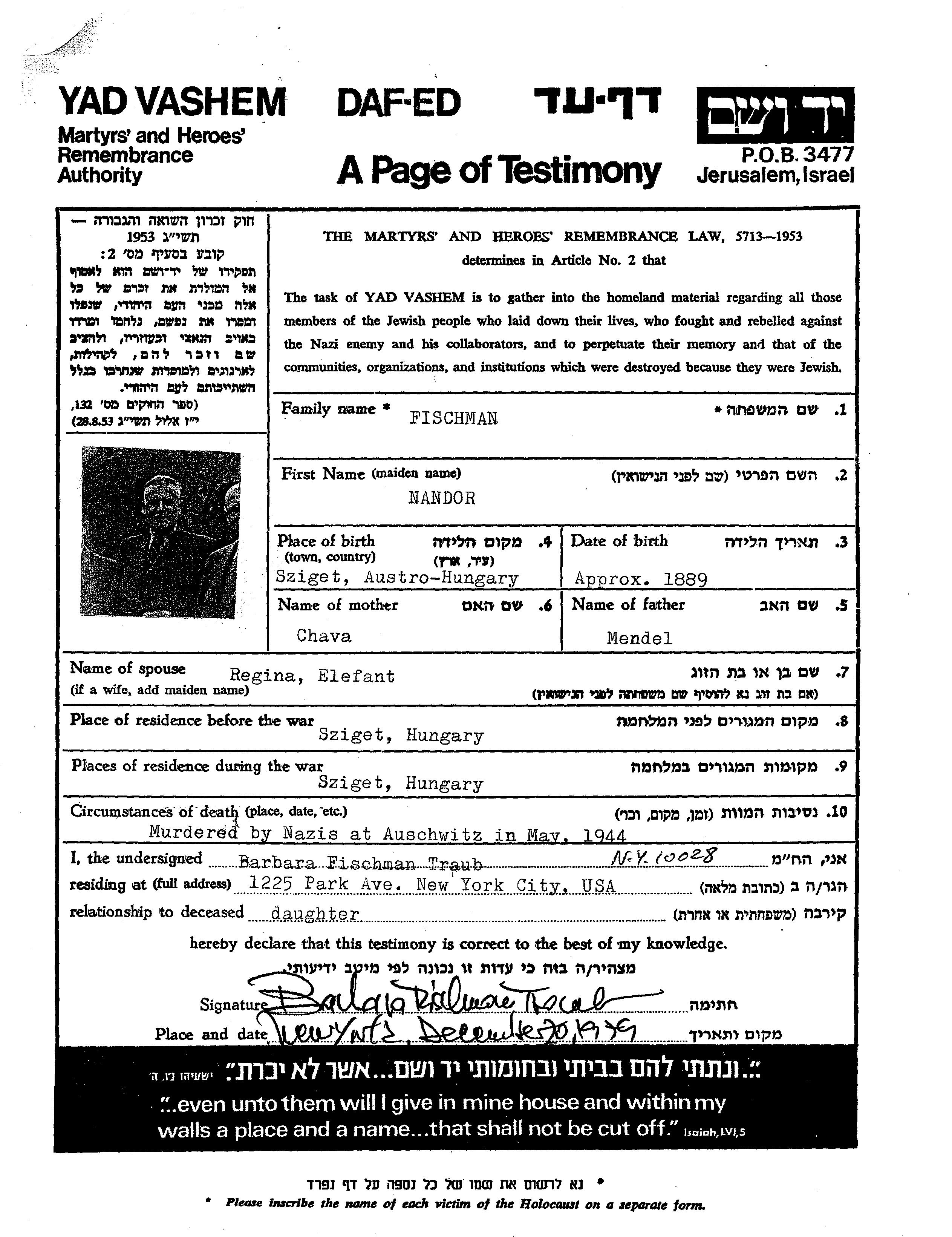 ננדור נרצח בשואה. מקום המוות: Auschwitz שבפולין בשנת 05/1944.