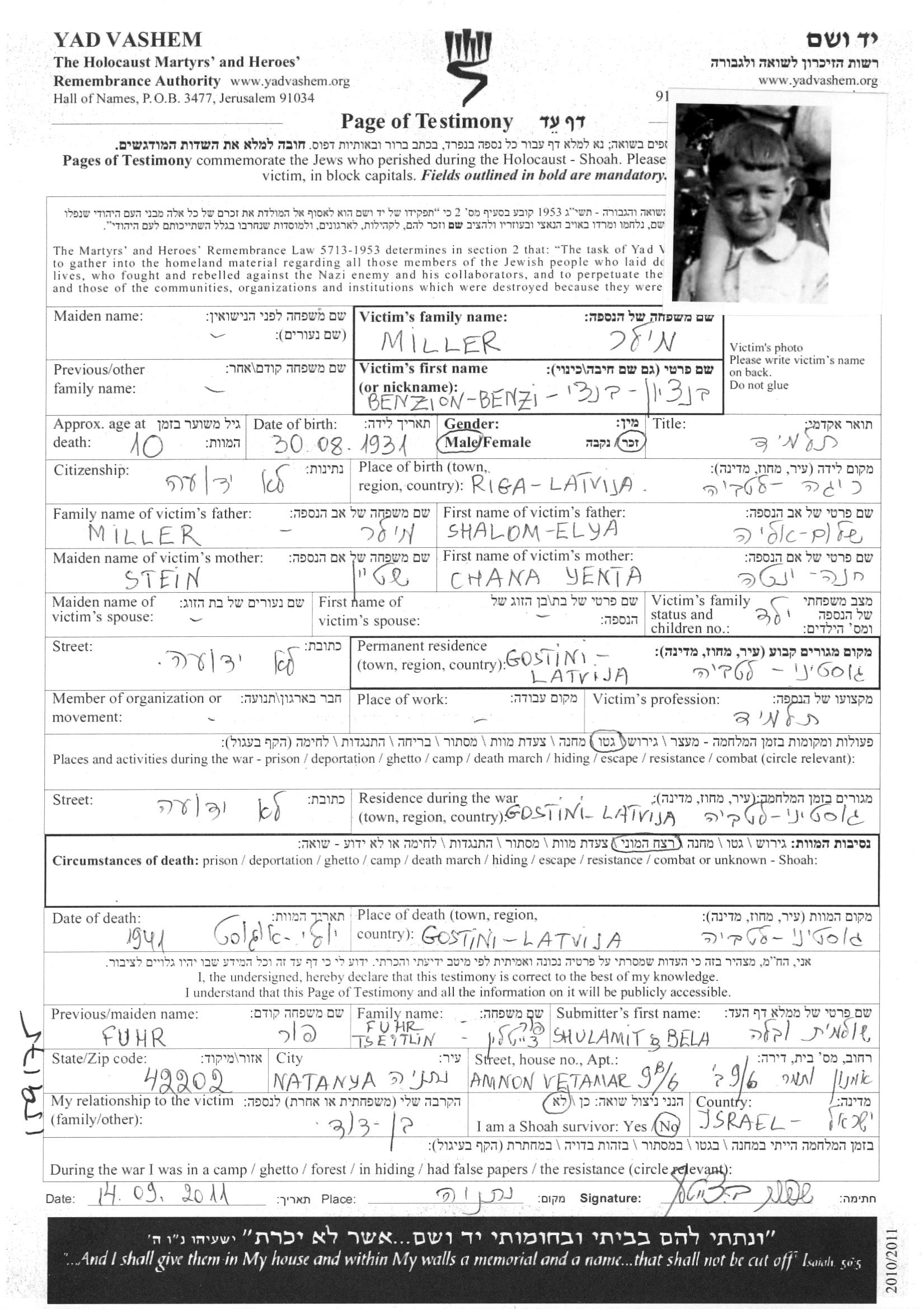 Ben Tzion Miller נולד בRiga שבלטביה בשנת 1931. הוא היה תלמיד. לפני מלחמת העולם השניה התגורר בGostini שבלטביה.