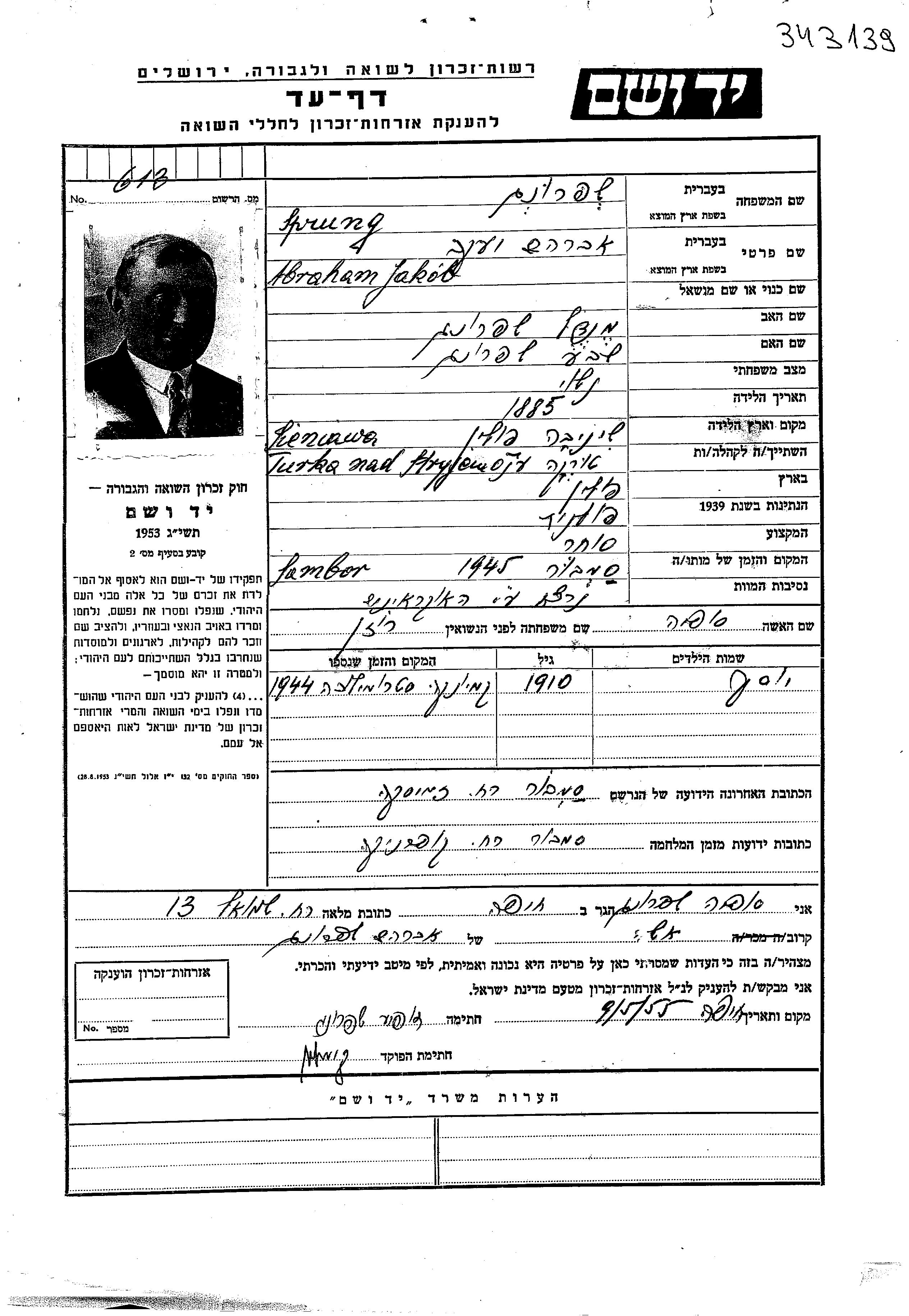 הוא נרצח בשואה. מקום המוות: Sambor שבפולין בשנת 1945.