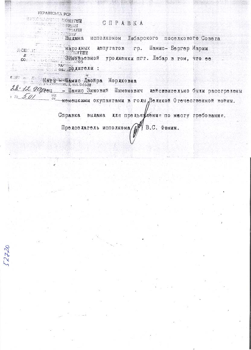 היא נרצחה בשואה. מקום המוות: Lyubar שבאוקראינה (ברה"מ) בשנת 13/09/1941.
