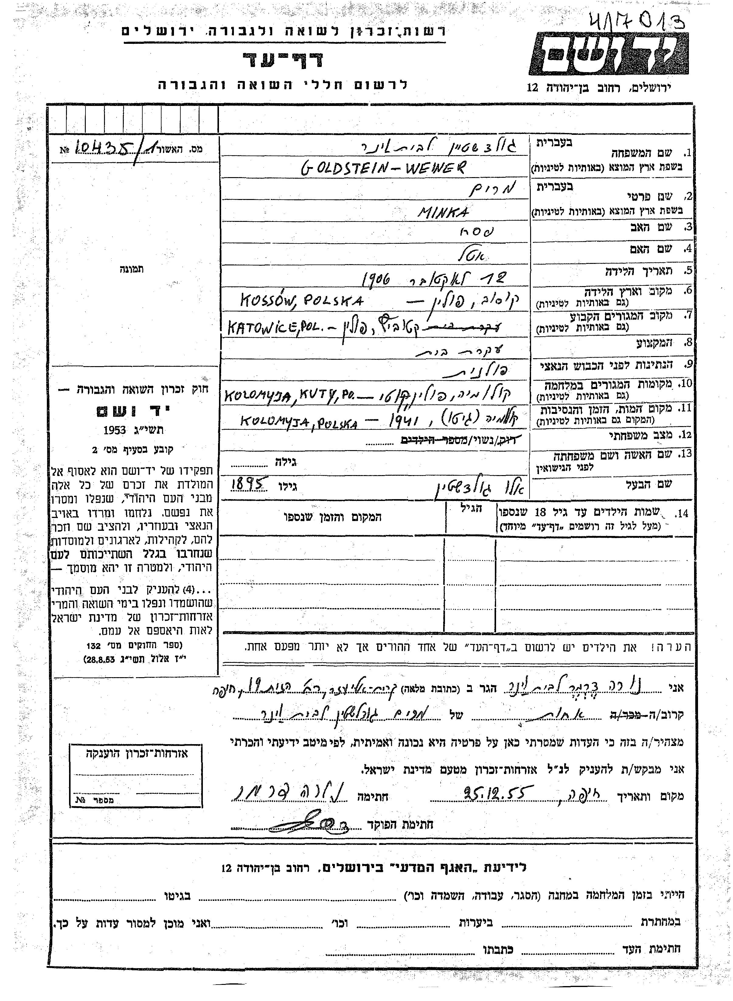 Minka מרים Goldstein לבית Weiner וינר נולדה בKosow שבפולין בשנת 1906. היא היתה עקרת בית. לפני מלחמת העולם השניה התגוררה בKatowice שבפולין.