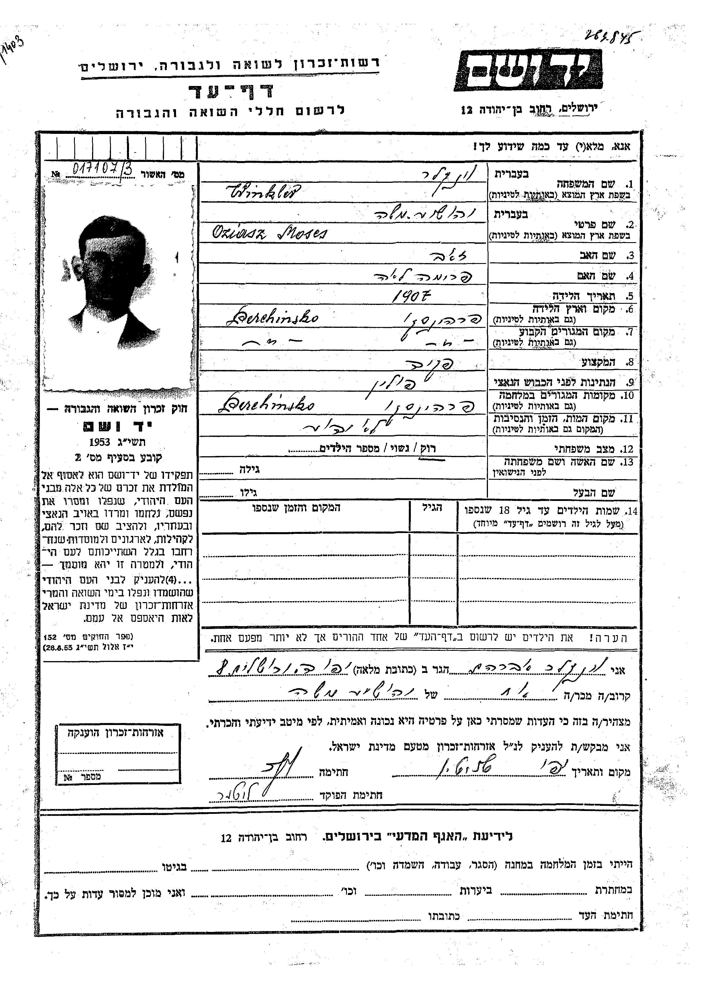 Oziasz Moses יהושוע Winkler נולד בPerehinsko שבפולין בשנת 1907. הוא היה פקיד. לפני מלחמת העולם השניה התגורר בPerehinsko שבפולין.