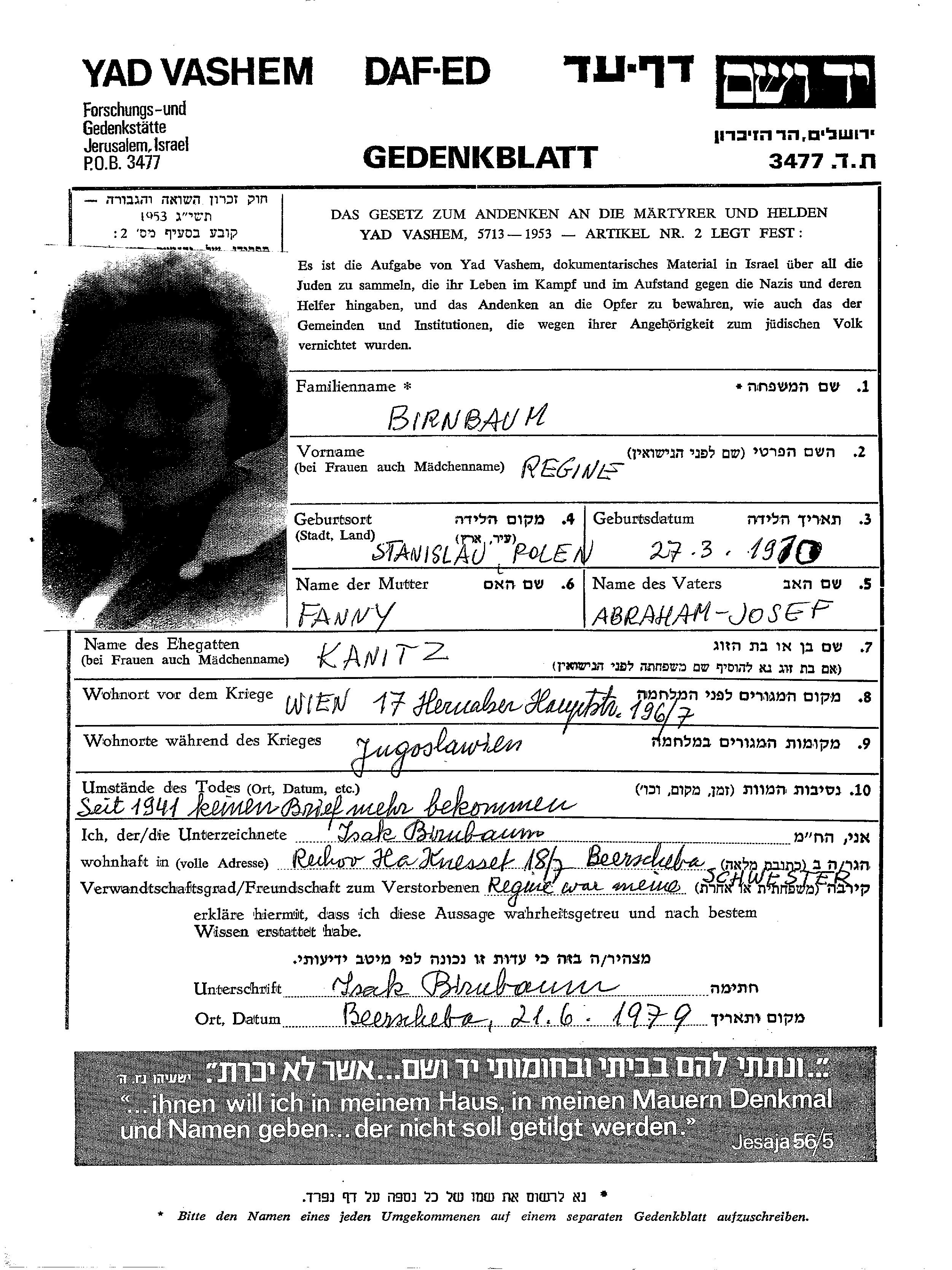 Regine בירנבאום לבית קניץ נולדה בStanislawow שבפולין בשנת 1910. לפני מלחמת העולם השניה התגוררה בWien שבאוסטריה.