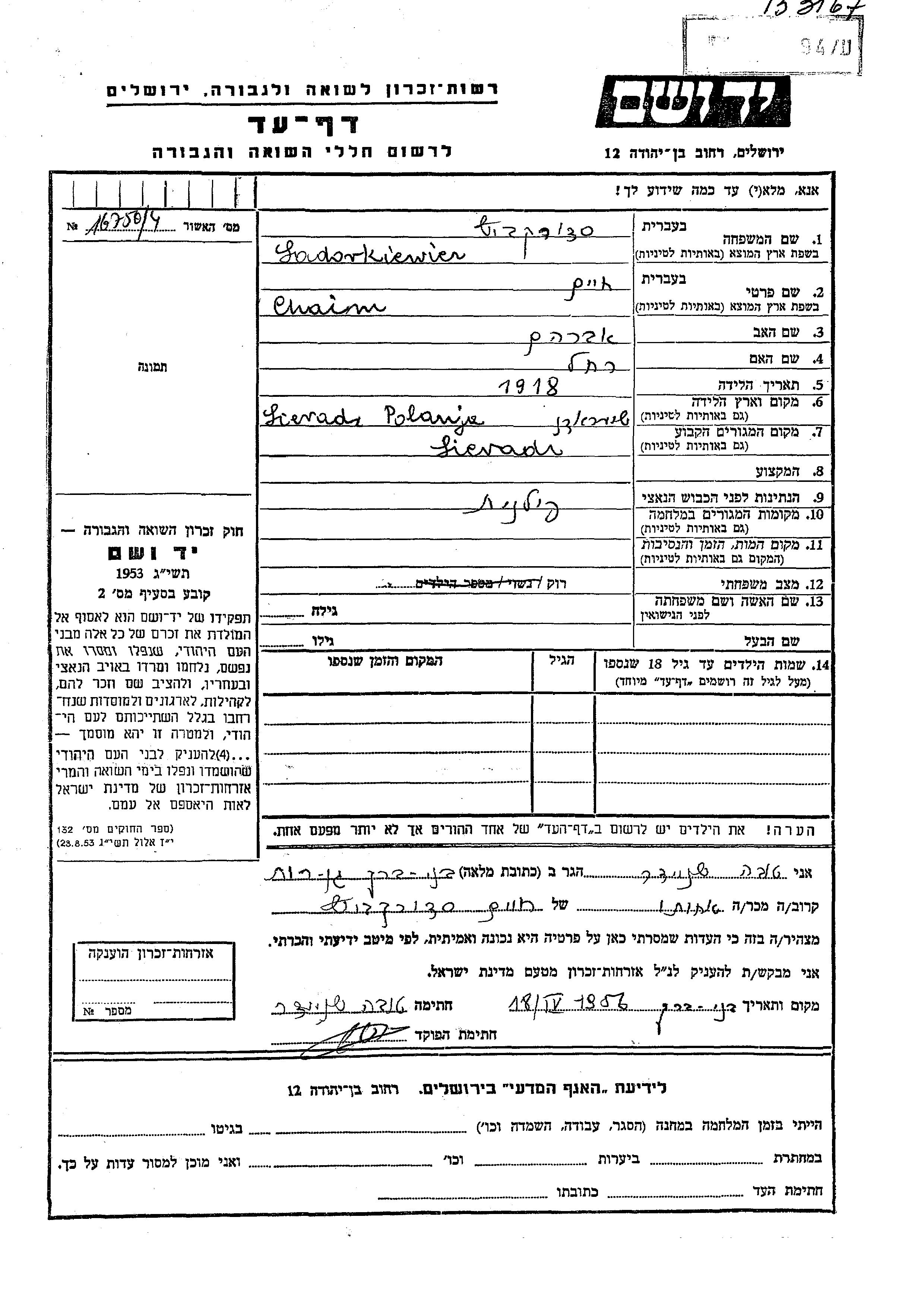| Sadorkiewicz | חיים | 1918 | Sieradz, פולין | דף-עד |