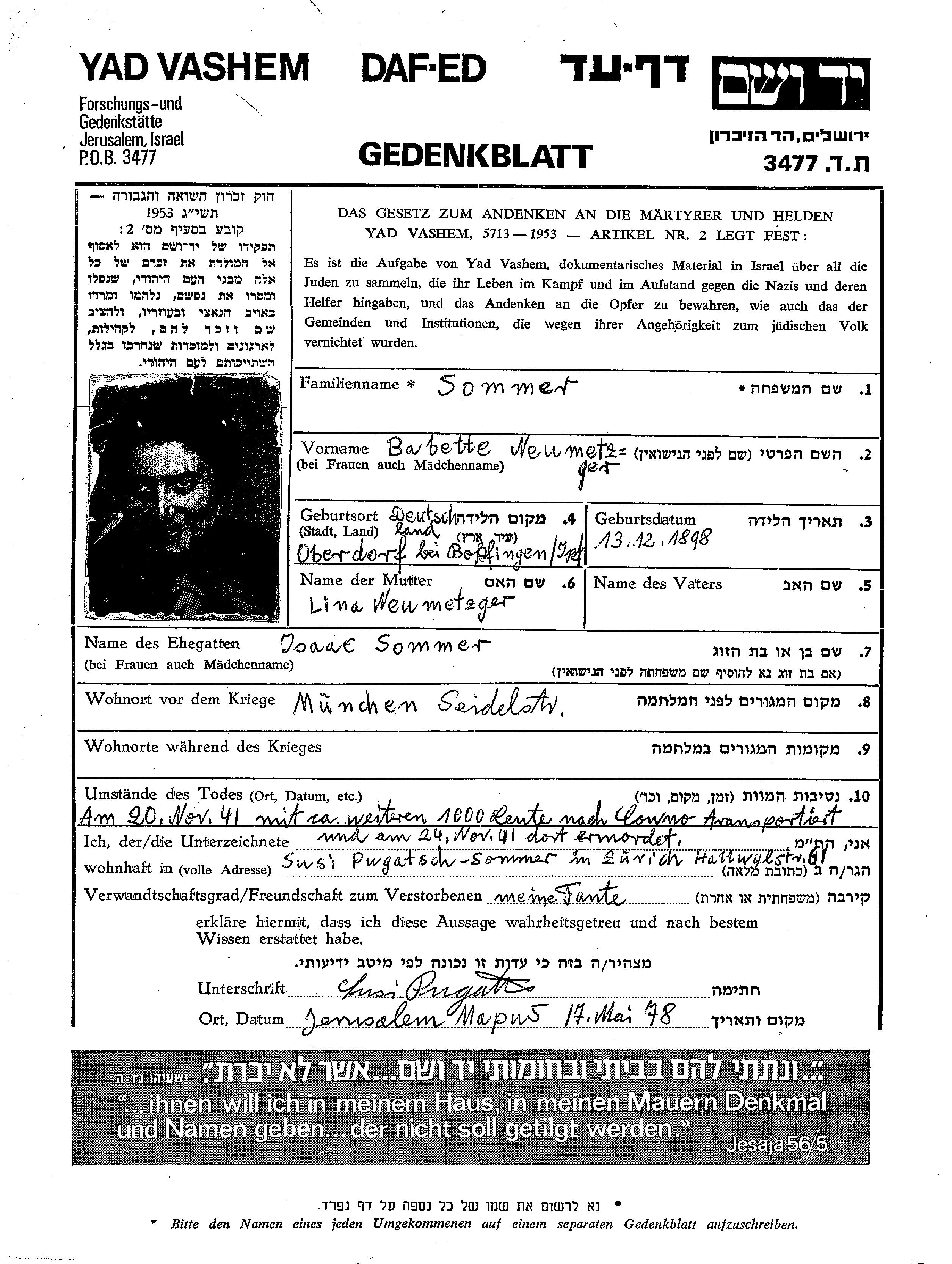 Babette Sommer לבית Neumetzger נולדה בOberdorf am Ipf שבגרמניה בשנת 1898. לפני מלחמת העולם השניה התגוררה בMuenchen שבגרמניה.