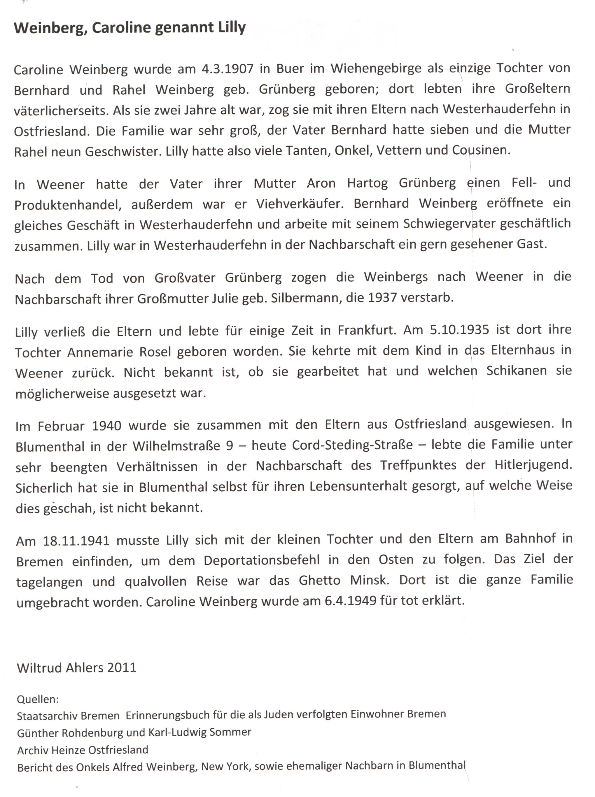 Caroline Weniberger נולדה בGelsenkirchen שבגרמניה בשנת 1907. לפני מלחמת העולם השניה התגוררה בWeener Ems שבגרמניה.